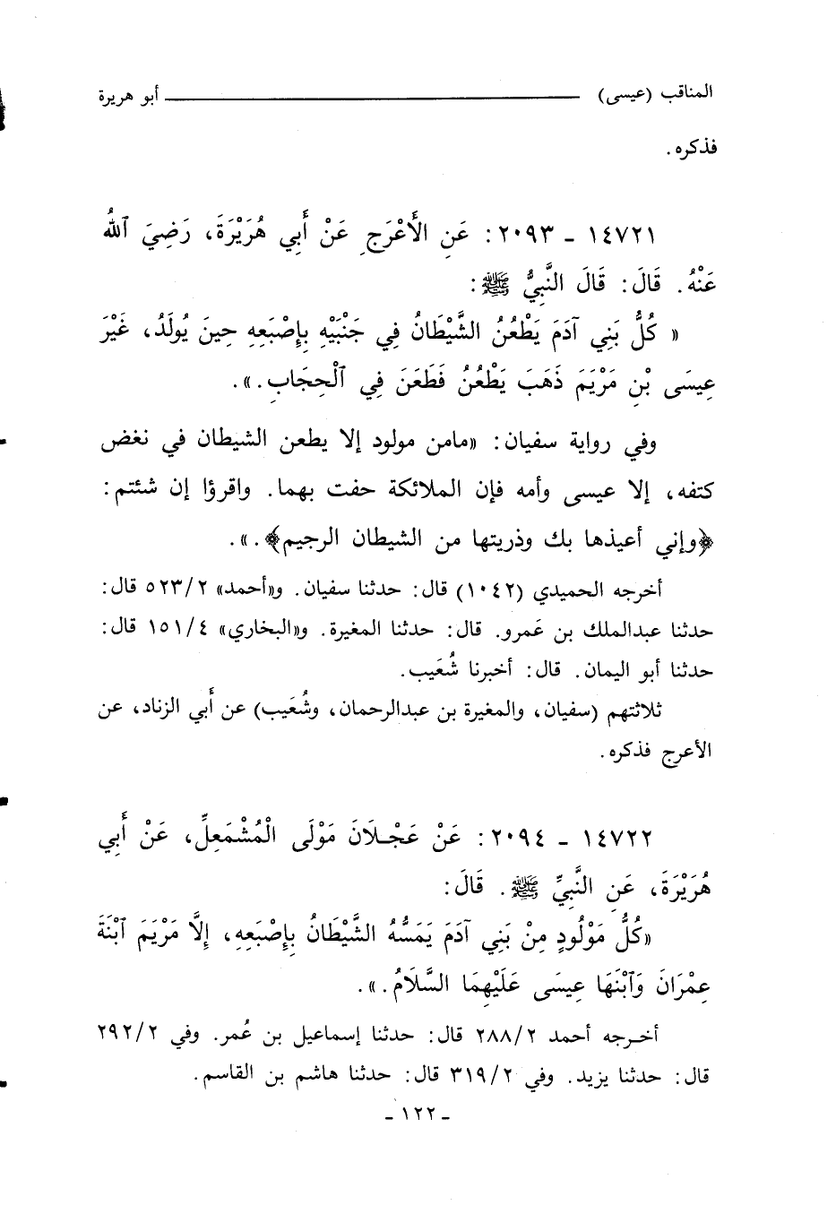 كُلُّ مَوْلُودٍ مِنْ بَنِى آدَمَ يَمَسُّهُ الشَّيْطَانُ بِإِصْبَعِهِ إِلَاّ مَرْيَمَ ابْنَةَ عِمْرَانَ وَابْنَهَا عِيسَى عَلَيْهِمَا السَّلَامُ.