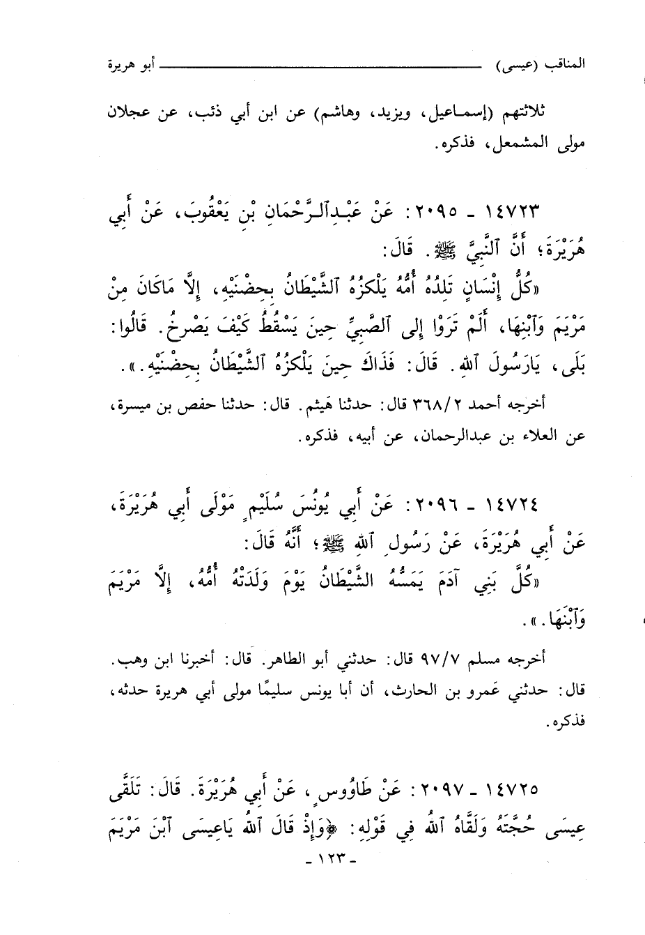 كُلُّ إِنْسَانٍ تَلِدُهُ أُمُّهُ يَلْكُزُهُ الشَّيْطَانُ فِى حِضْنَيْهِ إِلَاّ مَا كَانَ مِنْ مَرْيَمَ وَابْنِهَا أَلَمْ تَرَوْا إِلَى الصَّبِىِّ حِينَ يَسْقُطُ كَيْفَ يَصْرُخُ. قَالُوا بَلَى يَا رَسُولَ اللهِ. قَالَ فَذَاكَ حِينَ يَلْكُزُهُ الشَّيْطَانُ بِحِضْنَيْهِ.