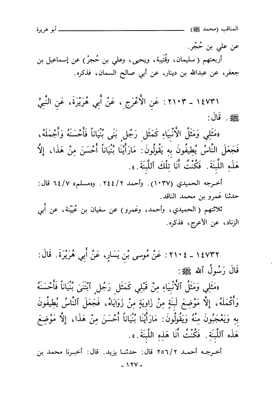 إِنَّمَا مَثَلِى وَمَثَلُ الأَنْبِيَاءِ قَبْلِى كَمَثَلِ رَجُلٍ بَنَى بِنَاءً فَأَحْسَنَهُ وَأَكْمَلَهُ وَأَجْمَلَهُ إِلَاّ مَوْضِعَ لَبِنَةٍ فَجَعَلَ النَّاسُ يَطِيفُونَ بِهِ فَيَقُولُونَ مَا رَأَيْنَا بِنَاءً أَحْسَنَ مِنْ هَذَا لَوْلَا مَوْضِعُ هَذِهِ اللَّبِنَةِ أَلَا وَكُنْتُ أَنَا تِلْكَ اللَّبِنَة.