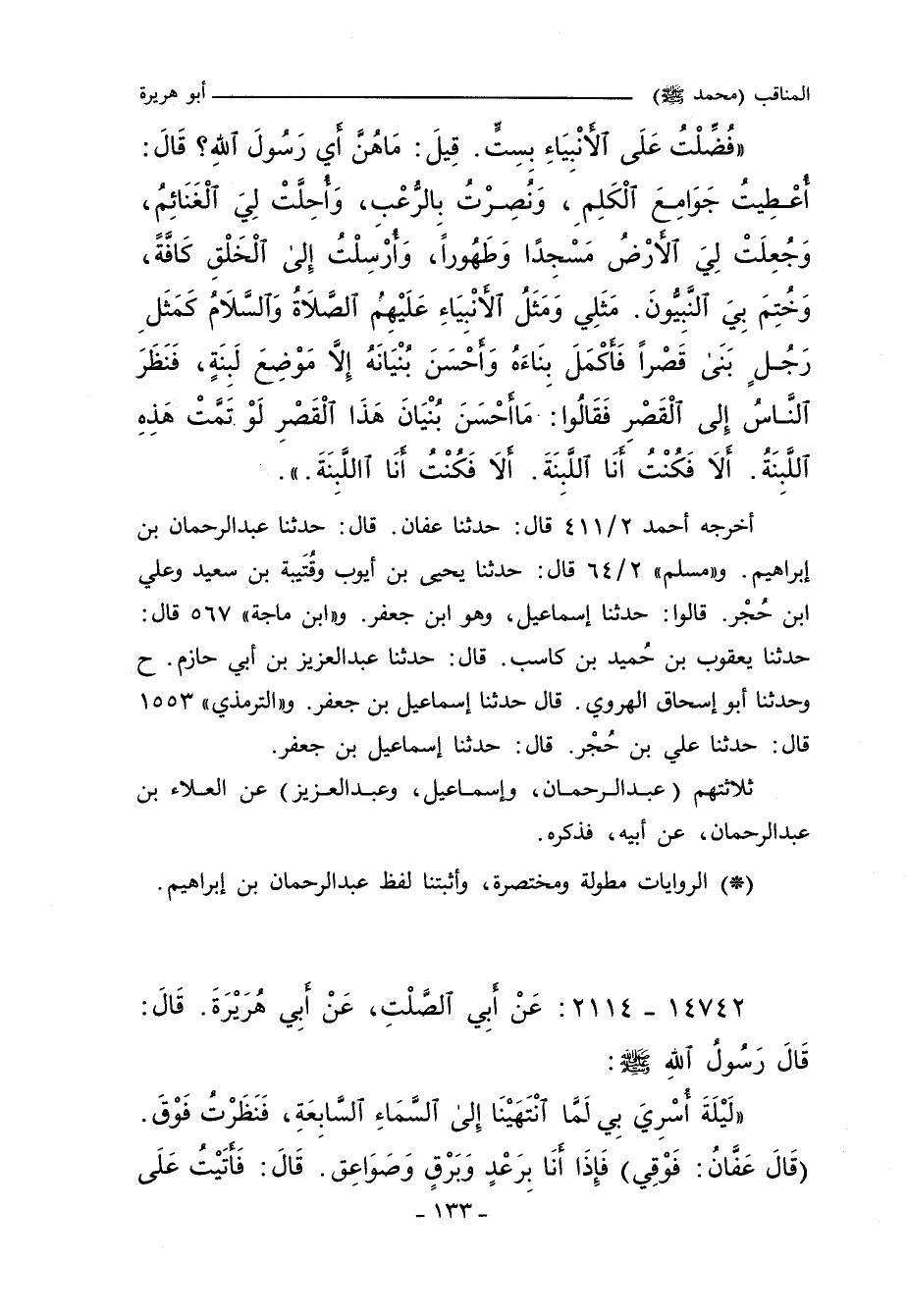 فُضِّلْتُ عَلَى الأَنْبِيَاءِ بِسِتٍّ. قِيلَ مَا هُنَّ أَىْ رَسُولَ اللهِ قَالَ أُعْطِيتُ جَوَامِعَ الْكَلِمِ وَنُصِرْتُ بِالرُّعْبِ وَأُحِلَّتْ لِىَ الْغَنَائِمُ وَجُعِلَتْ لِىَ الأَرْضُ طَهُورًا وَمَسْجِدًا وَأُرْسِلْتُ إِلَى الْخَلْقِ كَافَّةً وَخُتِمَ بِىَ النَّبِيُّونَ مَثَلِى وَمَثَلُ الأَنْبِيَاءِ عَلَيْهِمُ الصَّلَاةُ وَالسَّلَامُ كَمَثَلِ رَجُلٍ بَنَى قَصْرًا فَأَكْمَلَ بِنَاءَهُ وَأَحْسَنَ بُنْيَانَهُ إِلَاّ مَوْضِعَ لَبِنَةٍ فَنَظَرَ النَّاسُ إِلَى الْقَصْرِ فَقَالُوا مَا أَحْسَنَ بُنْيَانَ هَذَا الْقَصْرِ لَوْ تَمَّتْ هَذِهِ اللَّبِنَةُ أَلَا فَكُنْتُ أَنَا اللَّبِنَةَ أَلَا فَكُنْتُ أَنَا اللَّبِنَةَ.