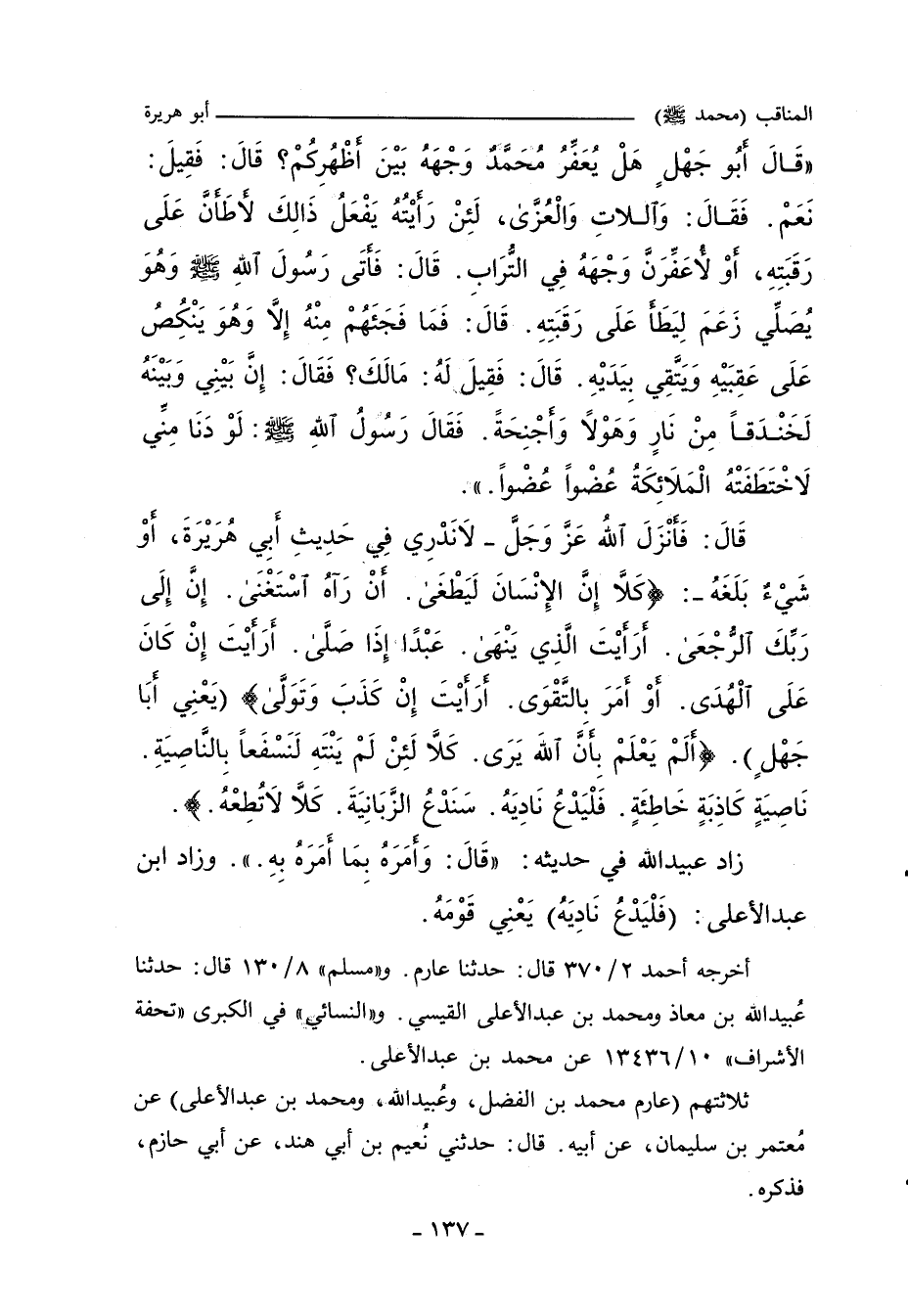 هَلْ يُعَفِّرُ مُحَمَّدٌ وَجْهَهُ بَيْنَ أَظْهُرِكُمْ قَالَ فَقِيلَ نَعَمْ. فَقَالَ وَالَّلَاتِ وَالْعُزَّى - يَمِينًا يَحْلِفُ بِهَا - لَئِنْ رَأَيْتُهُ يَفْعَلُ ذَلِكَ لأَطَأَنَّ عَلَى رَقَبَتِهِ أَوْ لأُعَفِّرَنَّ وَجْهَهُ فِى التُّرَابِ. قَالَ فَأَتَى رَسُولَ اللهِ صلى الله عليه وسلم وَهُوَ يُصَلِّى زَعَمَ لَيَطَأُ عَلَى رَقَبَتِهِ. قَالَ فَمَا فَجَأَهُمْ مِنْهُ إِلَاّ وَهُوَ يَنْكِصُ عَلَى عَقِبَيْهِ وَيَتَّقِى بِيَدَيْهِ. قَالَ قَالُوا لَهُ مَا لَكَ قَالَ إِنَّ بَيْنِى وَبَيْنَهُ لَخَنْدَقًا مِنْ نَارٍ وَهَوْلاً وَأَجْنِحَةً. قَالَ فَقَالَ رَسُولُ اللهِ صلى الله عليه وسلم لَوْ دَنَا مِنِّي لَخَطَفَتْهُ الْمَلَائِكَةُ عُضْوًا عُضْوًا. قَالَ فَأَنْزَلَ لَا أَدْرِى فِى حَدِيثِ أَبِى هُرَيْرَةَ أَوْ شَىْءٌ بَلَغَهُ ?إِنَّ الإِنْسَانَ لَيَطْغَى أَنْ رَآهُ اسْتَغْنَى إِنَّ إِلَى رَبِّكَ الرُّجْعَى أَرَأَيْتَ الَّذِى يَنْهَى عَبْدًا إِذَا صَلَّى أَرَأَيْتَ إِنْ كَانَ عَلَى الْهُدَى أَوْ أَمَرَ بِالتَّقْوَى أَرَأَيْتَ إِنْ كَذَّبَ وَتَوَلَّى? يَعْنِى أَبَا جَهْلٍ ?أَلَمْ يَعْلَمْ بِأَنَّ اللَّهَ يَرَى كَلَاّ لَئِنْ لَمْ يَنْتَهِ لَنَسْفَعًا بِالنَّاصِيَةِ نَاصِيَةٍ كَاذِبَةٍ خَاطِئَةٍ فَلْيَدْعُ نَادِيَهُ? قَالَ يَدْعُو قَوْمَهُ ?سَنَدْعُ الزَّبَانِيَةَ? قَالَ يَعْنِى الْمَلَائِكَةَ ?كَلَاّ لَا تُطِعْهُ وَاسْجُدْ وَاقْتَرِبْ?.