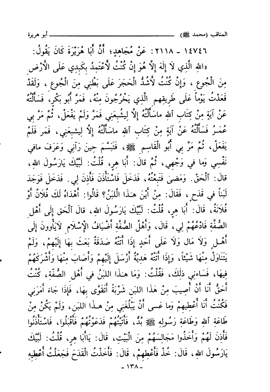 اللهِ الَّذِى لَا إِلَهَ إِلَاّ هُوَ إِنْ كُنْتُ لأَعْتَمِدُ بِكَبِدِى عَلَى الأَرْضِ مِنَ الْجُوعِ، وَإِنْ كُنْتُ لأَشُدُّ الْحَجَرَ عَلَى بَطْنِى مِنَ الْجُوعِ، وَلَقَدْ قَعَدْتُ يَوْمًا عَلَى طَرِيقِهِمُ الَّذِى يَخْرُجُونَ مِنْهُ، فَمَرَّ أَبُو بَكْرٍ، فَسَأَلْتُهُ عَنْ آيَةٍ مِنْ كِتَابِ اللهِ، مَا سَأَلْتُهُ إِلَاّ لِيُشْبِعَنِى، فَمَرَّ وَلَمْ يَفْعَلْ، ثُمَّ مَرَّ بِى عُمَرُ فَسَأَلْتُهُ عَنْ آيَةٍ مِنْ كِتَابِ اللهِ، مَا سَأَلْتُهُ إِلَاّ لِيُشْبِعَنِى، فَمَرَّ فَلَمْ يَفْعَلْ، ثُمَّ مَرَّ بِى أَبُو الْقَاسِمِ صلى الله عليه وسلم فَتَبَسَّمَ حِينَ رَآنِى وَعَرَفَ، مَا فِى نَفْسِى وَمَا فِى وَجْهِى ثُمَّ قَالَ أَبَا هِرٍّ. قُلْتُ لَبَّيْكَ يَا رَسُولَ اللهِ. قَالَ الْحَقْ. وَمَضَى فَتَبِعْتُهُ، فَدَخَلَ فَاسْتَأْذَنَ، فَأَذِنَ لِى، فَدَخَلَ فَوَجَدَ لَبَنًا فِى قَدَحٍ فَقَالَ مِنْ أَيْنَ هَذَا اللَّبَنُ. قَالُوا أَهْدَاهُ لَكَ فُلَانٌ أَوْ فُلَانَةُ. قَالَ أَبَا هِرٍّ. قُلْتُ لَبَّيْكَ يَا رَسُولَ اللهِ. قَالَ الْحَقْ إِلَى أَهْلِ الصُّفَّةِ فَادْعُهُمْ لِى. قَالَ وَأَهْلُ الصُّفَّةِ أَضْيَافُ الإِسْلَامِ، لَا يَأْوُونَ إِلَى أَهْلٍ وَلَا مَالٍ، وَلَا عَلَى أَحَدٍ، إِذَا أَتَتْهُ صَدَقَةٌ بَعَثَ بِهَا إِلَيْهِمْ، وَلَمْ يَتَنَاوَلْ مِنْهَا شَيْئًا، وَإِذَا أَتَتْهُ هَدِيَّةٌ أَرْسَلَ إِلَيْهِمْ، وَأَصَابَ مِنْهَا وَأَشْرَكَهُمْ فِيهَا، فَسَاءَنِى ذَلِكَ فَقُلْتُ وَمَا هَذَا اللَّبَنُ فِى أَهْلِ الصُّفَّةِ كُنْتُ أَحَقُّ أَنَا أَنْ أُصِيبَ مِنْ هَذَا اللَّبَنِ شَرْبَةً أَتَقَوَّى بِهَا، فَإِذَا جَاءَ أَمَرَنِى فَكُنْتُ أَنَا أُعْطِيهِمْ، وَمَا عَسَى أَنْ يَبْلُغَنِى مِنْ هَذَا