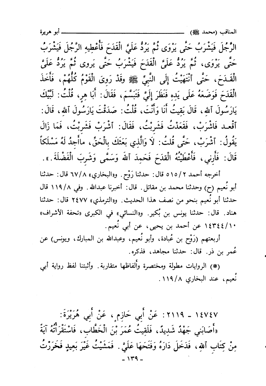 الرَّجُلَ فَيَشْرَبُ حَتَّى يَرْوَى، ثُمَّ يَرُدُّ عَلَىَّ الْقَدَحَ، فَأُعْطِيهِ الرَّجُلَ فَيَشْرَبُ حَتَّى يَرْوَى، ثُمَّ يَرُدُّ عَلَىَّ الْقَدَحَ فَيَشْرَبُ حَتَّى يَرْوَى، ثُمَّ يَرُدُّ عَلَىَّ الْقَدَحَ، حَتَّى انْتَهَيْتُ إِلَى النَّبِيِّ صلى الله عليه وسلم وَقَدْ رَوِىَ الْقَوْمُ كُلُّهُمْ، فَأَخَذَ الْقَدَحَ فَوَضَعَهُ عَلَى يَدِهِ فَنَظَرَ إِلَىَّ فَتَبَسَّمَ فَقَالَ أَبَا هِرٍّ. قُلْتُ لَبَّيْكَ يَا رَسُولَ اللهِ. قَالَ بَقِيتُ أَنَا وَأَنْتَ. قُلْتُ صَدَقْتَ يَا رَسُولَ اللهِ. قَالَ اقْعُدْ فَاشْرَبْ. فَقَعَدْتُ فَشَرِبْتُ. فَقَالَ اشْرَبْ. فَشَرِبْتُ، فَمَا زَالَ يَقُولُ اشْرَبْ. حَتَّى قُلْتُ لَا وَالَّذِى بَعَثَكَ بِالْحَقِّ، مَا أَجِدُ لَهُ مَسْلَكًا. قَالَ فَأَرِنِى. فَأَعْطَيْتُهُ الْقَدَحَ فَحَمِدَ اللَّهَ وَسَمَّى، وَشَرِبَ الْفَضْلَة.