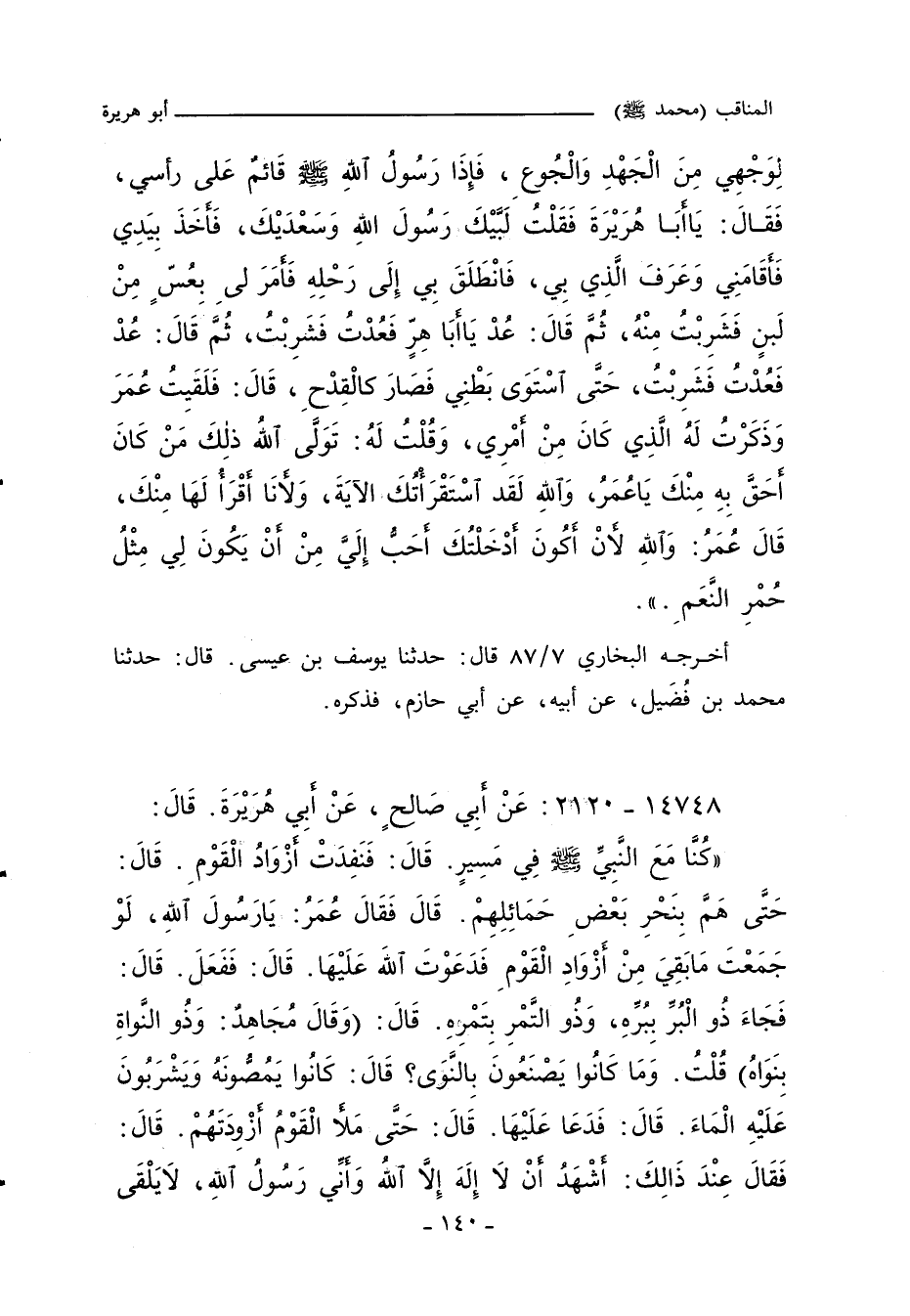 لِوَجْهِى مِنَ الْجَهْدِ وَالْجُوعِ فَإِذَا رَسُولُ اللهِ صلى الله عليه وسلم قَائِمٌ عَلَى رَأْسِى فَقَالَ يَا أَبَا هُرَيْرَةَ. فَقُلْتُ لَبَّيْكَ رَسُولَ اللهِ وَسَعْدَيْكَ. فَأَخَذَ بِيَدِى فَأَقَامَنِى، وَعَرَفَ الَّذِى بِى، فَانْطَلَقَ بِى إِلَى رَحْلِهِ، فَأَمَرَ لِى بِعُسٍّ مِنْ لَبَنٍ فَشَرِبْتُ مِنْهُ، ثُمَّ قَالَ عُدْ يَا أَبَا هِرٍّ. فَعُدْتُ فَشَرِبْتُ، ثُمَّ قَالَ عُدْ. فَعُدْتُ فَشَرِبْتُ حَتَّى اسْتَوَى بَطْنِى فَصَارَ كَالْقِدْحِ - قَالَ - فَلَقِيتُ عُمَرَ وَذَكَرْتُ لَهُ الَّذِى كَانَ مِنْ أَمْرِى وَقُلْتُ لَهُ تَوَلَّى اللَّهُ ذَلِكَ مَنْ كَانَ أَحَقَّ بِهِ مِنْكَ يَا عُمَرُ، وَاللهِ لَقَدِ اسْتَقْرَأْتُكَ الآيَةَ وَلأَنَا أَقْرَأُ لَهَا مِنْكَ. قَالَ عُمَرُ وَاللهِ لأَنْ أَكُونَ أَدْخَلْتُكَ أَحَبُّ إِلَىَّ مِنْ أَنْ يَكُونَ لِى مِثْلُ حُمْرِ النَّعَمِ.