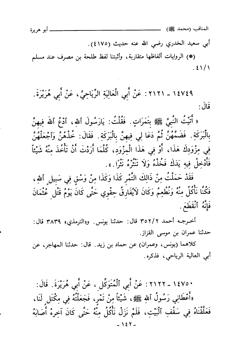 أَتَيْتُ النَّبِيَّ صلى الله عليه وسلم بِتَمَرَاتٍ فَقُلْتُ يَا رَسُولَ اللهِ ادْعُ اللَّهَ فِيهِنَّ بِالْبَرَكَةِ. فَضَمَّهُنَّ ثُمَّ دَعَا لِى فِيهِنَّ بِالْبَرَكَةِ فَقَالَ لِى خُذْهُنَّ وَاجْعَلْهُنَّ فِى مِزْوَدِكَ هَذَا - أَوْ فِى هَذَا الْمِزْوَدِ - كُلَّمَا أَرَدْتَ أَنْ تَأْخُذَ مِنْهُ شَيْئًا فَأَدْخِلْ فِيهِ يَدَكَ فَخُذْهُ وَلَا تَنْثُرْهُ نَثْرًا. فَقَدْ حَمَلْتُ مِنْ ذَلِكَ التَّمْرِ كَذَا وَكَذَا مِنْ وَسْقٍ فِى سَبِيلِ اللهِ فَكُنَّا نَأْكُلُ مِنْهُ وَنُطْعِمُ وَكَانَ لَا يُفَارِقُ حَقْوِى حَتَّى كَانَ يَوْمُ قَتْلِ عُثْمَانَ فَإِنَّهُ انْقَطَعَ. قَالَ أَبُو عِيسَى هَذَا حَدِيثٌ حَسَنٌ غَرِيبٌ مِنْ هَذَا الْوَجْهِ وَقَدْ رُوِىَ هَذَا الْحَدِيثُ مِنْ غَيْرِ هَذَا الْوَجْهِ عَنْ أَبِي هُرَيْرَةَ.