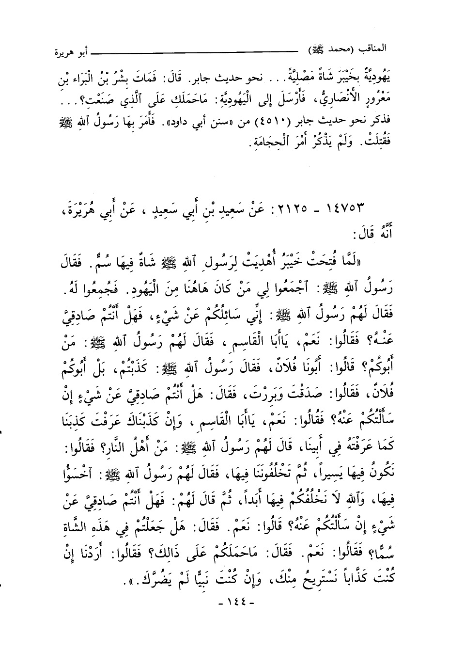 لَمَّا فُتِحَتْ خَيْبَرُ أُهْدِيَتْ لِرَسُولِ اللهِ صلى الله عليه وسلم شَاةٌ فِيهَا سَمٌّ، فَقَالَ رَسُولُ اللهِ صلى الله عليه وسلم اجْمَعُوا لِى مَنْ كَانَ هَا هُنَا مِنَ الْيَهُودِ. فَجُمِعُوا لَهُ فَقَالَ لَهُمْ رَسُولُ اللهِ صلى الله عليه وسلم إِنِّى سَائِلُكُمْ عَنْ شَىْءٍ فَهَلْ أَنْتُمْ صَادِقِىَّ عَنْهُ. فَقَالُوا نَعَمْ يَا أَبَا الْقَاسِمِ. فَقَالَ لَهُمْ رَسُولُ اللهِ صلى الله عليه وسلم مَنْ أَبُوكُمْ. قَالُوا أَبُونَا فُلَانٌ. فَقَالَ رَسُولُ اللهِ صلى الله عليه وسلم كَذَبْتُمْ بَلْ أَبُوكُمْ فُلَانٌ. فَقَالُوا صَدَقْتَ وَبَرِرْتَ. فَقَالَ هَلْ أَنْتُمْ صَادِقِىَّ عَنْ شَىْءٍ إِنْ سَأَلْتُكُمْ عَنْهُ. فَقَالُوا نَعَمْ يَا أَبَا الْقَاسِمِ، وَإِنْ كَذَبْنَاكَ عَرَفْتَ كَذِبَنَا كَمَا عَرَفْتَهُ فِى أَبِينَا. قَالَ لَهُمْ رَسُولُ اللهِ صلى الله عليه وسلم مَنْ أَهْلُ النَّارِ. فَقَالُوا نَكُونُ فِيهَا يَسِيرًا، ثُمَّ تَخْلُفُونَنَا فِيهَا. فَقَالَ لَهُمْ رَسُولُ اللهِ صلى الله عليه وسلم اخْسَئُوا فِيهَا، وَاللهِ لَا نَخْلُفُكُمْ فِيهَا أَبَدًا. ثُمَّ قَالَ لَهُمْ فَهَلْ أَنْتُمْ صَادِقِىَّ عَنْ شَىْءٍ إِنْ سَأَلْتُكُمْ عَنْهُ. قَالُوا نَعَمْ. فَقَالَ هَلْ جَعَلْتُمْ فِى هَذِهِ الشَّاةِ سُمًّا. فَقَالُوا نَعَمْ. فَقَالَ مَا حَمَلَكُمْ عَلَى ذَلِكَ. فَقَالُوا أَرَدْنَا إِنْ كُنْتَ كَذَّابًا نَسْتَرِيحُ مِنْكَ، وَإِنْ كُنْتَ نَبِيًّا لَمْ يَضُرَّكَ.