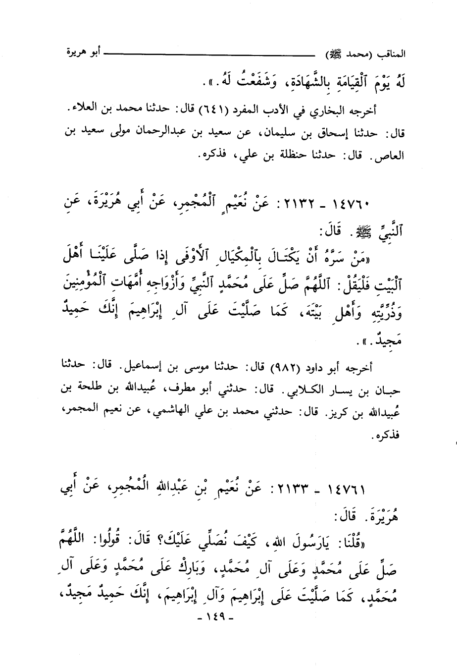 مَنْ سَرَّهُ أَنْ يَكْتَالَ بِالْمِكْيَالِ الأَوْفَى إِذَا صَلَّى عَلَيْنَا أَهْلَ الْبَيْتِ فَلْيَقُلِ اللَّهُمَّ صَلِّ عَلَى مُحَمَّدٍ النَّبِيِّ وَأَزْوَاجِهِ أُمَّهَاتِ الْمُؤْمِنِينَ وَذُرِّيَّتِهِ وَأَهْلِ بَيْتِهِ كَمَا صَلَّيْتَ عَلَى آلِ إِبْرَاهِيمَ إِنَّكَ حَمِيدٌ مَجِيد.