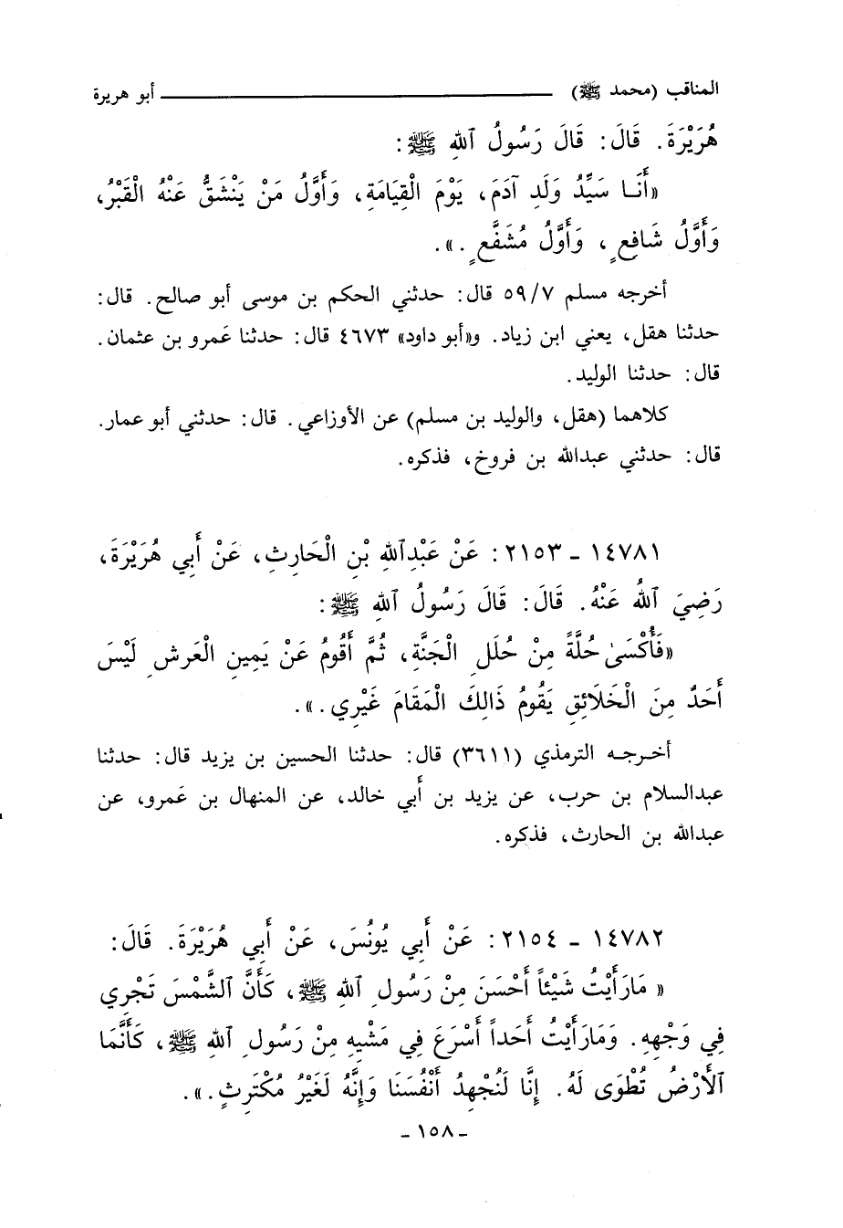 مَا رَأَيْتُ شَيْئًا أَحْسَنَ مِنْ رَسُولِ اللهِ صلى الله عليه وسلم كَأَنَّ الشَّمْسَ تَجْرِى فِى وَجْهِهِ وَمَا رَأَيْتُ أَحَدًا أَسْرَعَ فِى مَشْيِهِ مِنْ رَسُولِ اللهِ صلى الله عليه وسلم كَأَنَّمَا الأَرْضُ تُطْوَى لَهُ إِنَّا لَنُجْهِدُ أَنْفُسَنَا وَإِنَّهُ لَغَيْرُ مُكْتَرِثٍ.