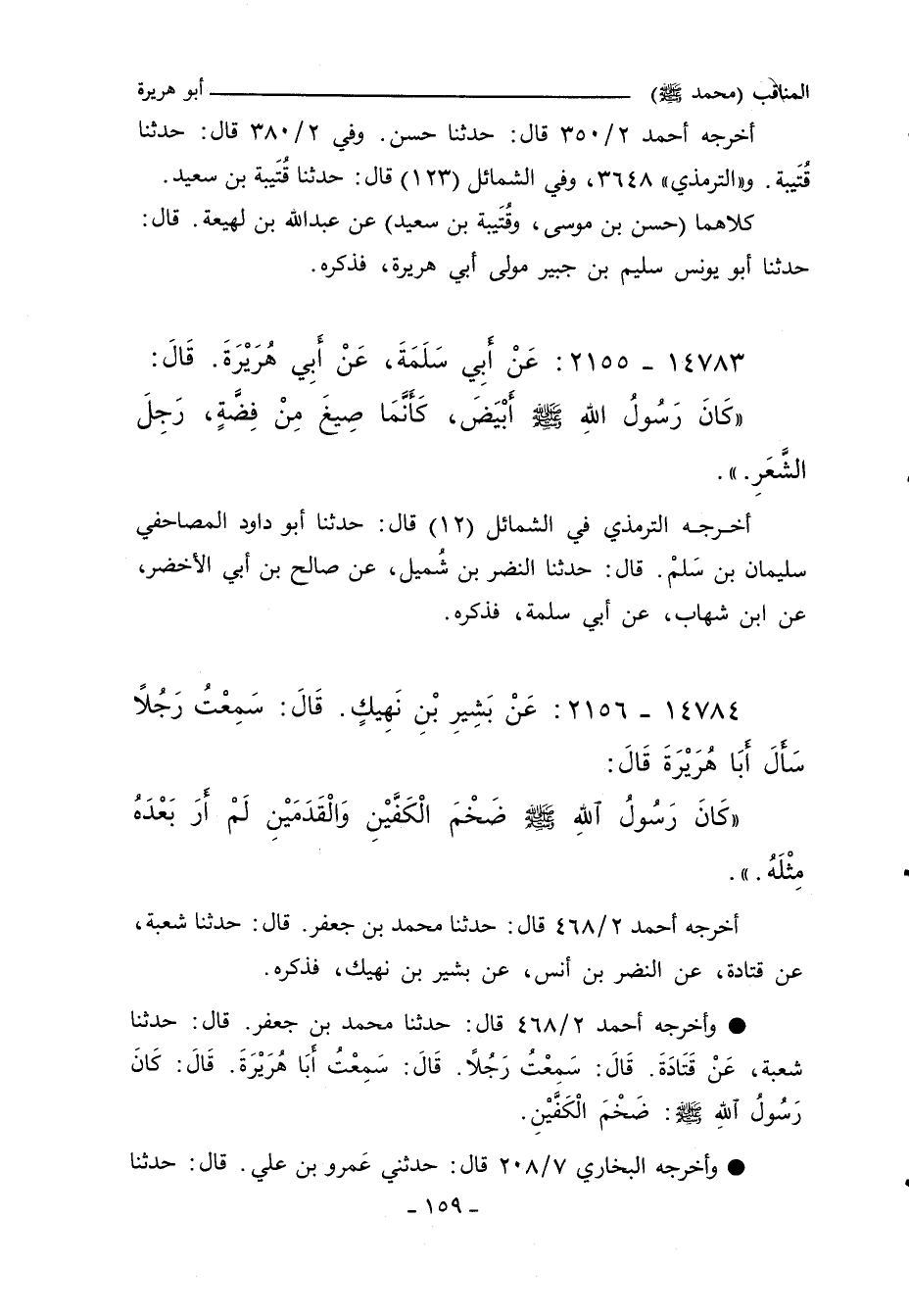 أخرجه أحمد ٢/ ٣٥٠ (٨٥٨٨) قال: حدَّثنا حسن. وفي ٢/ ٣٨٠ (٨٩٣٠) قال: حدَّثنا قُتَيبة. و"التِّرمِذي" ٣٦٤٨، وفي الشمائل (١٢٣) قال: حدَّثنا قُتَيبة بن سعيد.