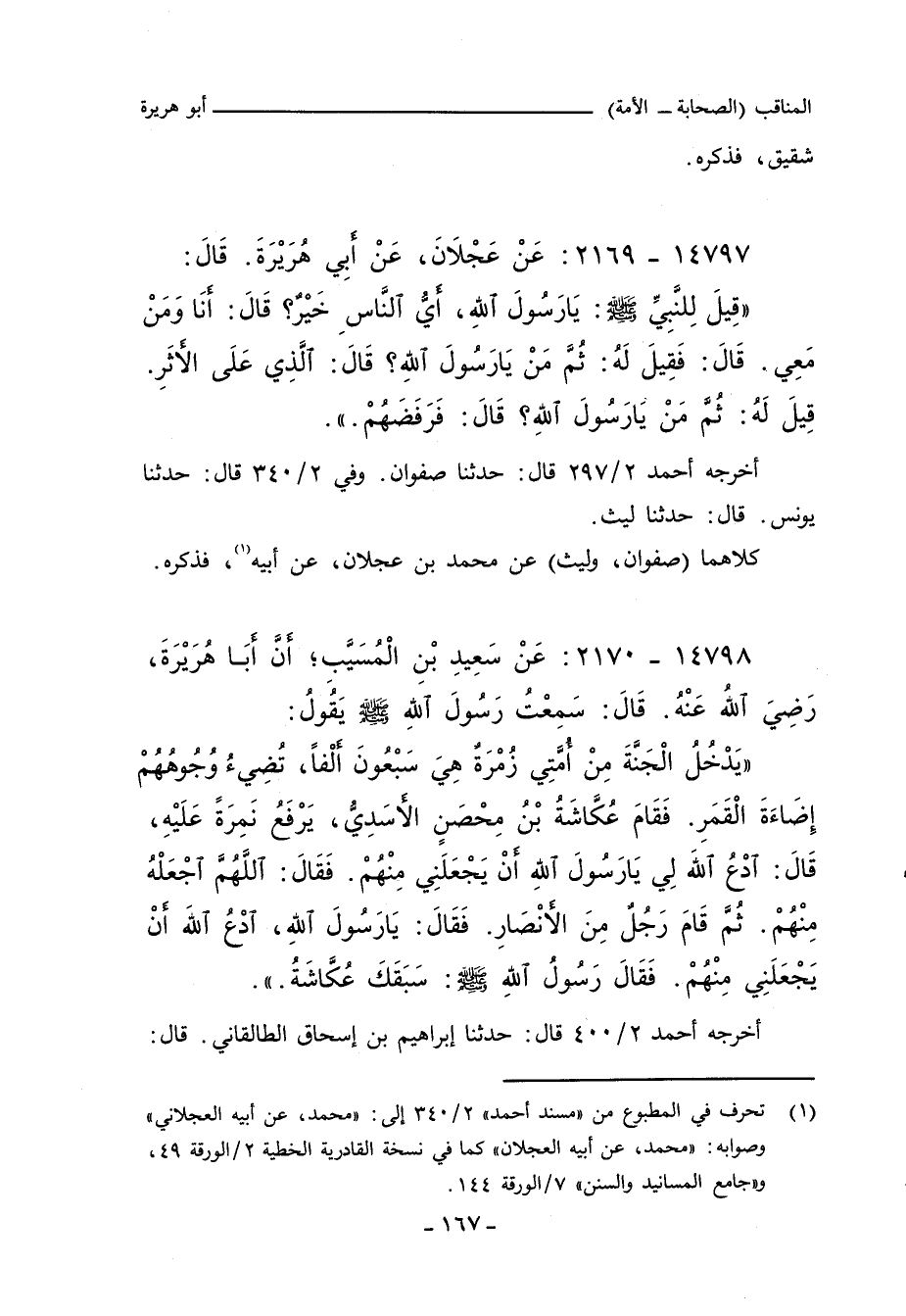 يَدْخُلُ مِنْ أُمَّتِى زُمْرَةٌ هُمْ سَبْعُونَ أَلْفًا تُضِئُ وُجُوهُهُمْ إِضَاءَةَ الْقَمَرِ لَيْلَةَ الْبَدْرِ. قَالَ أَبُو هُرَيْرَةَ فَقَامَ عُكَّاشَةُ بْنُ مِحْصَنٍ الأَسَدِىُّ يَرْفَعُ نَمِرَةً عَلَيْهِ فَقَالَ يَا رَسُولَ اللهِ ادْعُ اللَّهَ أَنْ يَجْعَلَنِى مِنْهُمْ. فَقَالَ رَسُولُ اللهِ صلى الله عليه وسلم اللَّهُمَّ اجْعَلْهُ مِنْهُمْ ثُمَّ قَامَ رَجُلٌ مِنَ الأَنْصَارِ فَقَالَ يَا رَسُولَ اللهِ ادْعُ اللَّهَ أَنْ يَجْعَلَنِى مِنْهُمْ. فَقَالَ رَسُولُ اللهِ صلى الله عليه وسلم سَبَقَكَ بِهَا عُكَّاشَة.