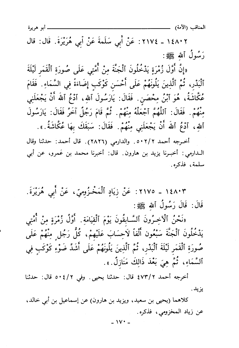 أَوَّلُ زَمْرَةٍ تَدْخُلُ الْجَنَّةَ مِنْ أُمَّتِى عَلَى صُورَةِ الْقَمَرِ لَيْلَةَ الْبَدْرِ ثُمَّ الَّذِينَ يَلُونَهُمْ عَلَى أَحْسَنِ كَوْكَبٍ دُرِّىٍّ إِضَاءَةً فِى السَّمَاءِ. فَقَامَ عُكَّاشَةُ بْنُ مِحْصَنٍ فَقَالَ يَا رَسُولَ اللهِ ادْعُ اللَّهَ أَنْ يَجْعَلَنِى مِنْهُمْ. قَالَ اللَّهُمَّ اجْعَلْهُ مِنْهُمْ. ثُمَّ قَامَ رَجُلٌ آخَرُ فَقَالَ يَا رَسُولَ اللهِ ادْعُ اللَّهَ أَنْ يَجْعَلَنِى مِنْهُمْ. قَالَ قَدْ سَبَقَكَ بِهَا عُكَّاشَة.