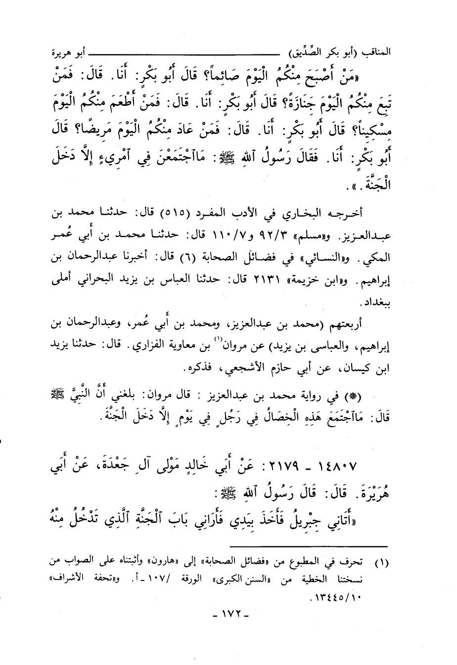 - في رواية محمد بن عبد العزيز: قال مروان: بلغني أَنَّ النّبيَ صلى الله عليه وسلم قَالَ: مَااٌجْتَمَعَ هَذِهِ الْخِصالُ فِي رَجُلٍ فِي يَوْمء إلا دَخَلَ الْجَنَّة.