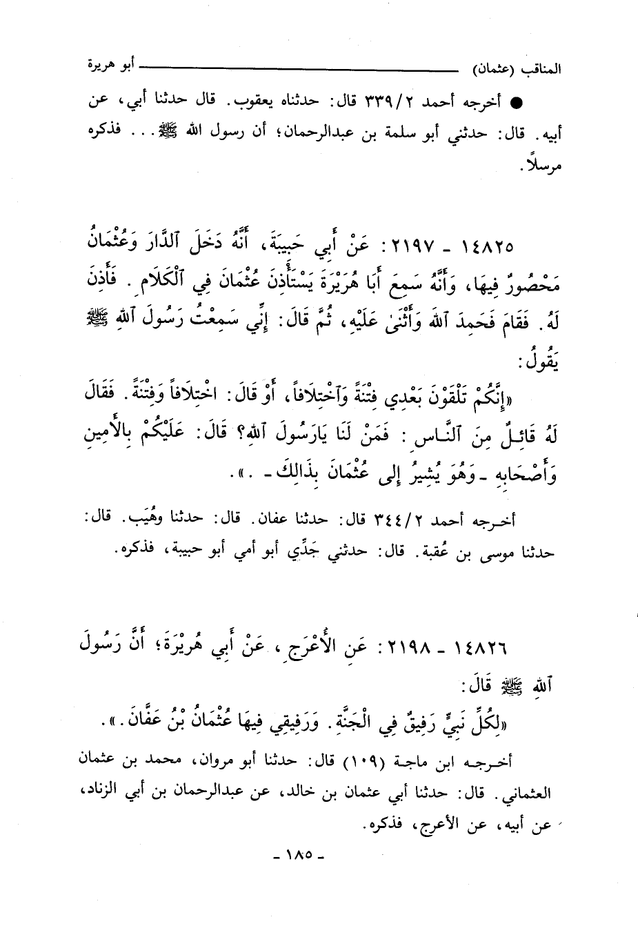 ١٤٨٢٥ - عَنْ أَبِي حَبِيبَةَ أَنَّهُ دَخَلَ الدَّارَ وَعُثْمَانُ مَحْصُورٌ فِيهَا وَأَنَّهُ سَمِعَ أَبَا هُرَيْرَةَ يَسْتَأْذِنُ عُثْمَانَ فِى الْكَلَامِ فَأَذِنَ لَهُ فَقَامَ فَحَمِدَ اللَّهَ وَأَثْنَى عَلَيْهِ ثُمَّ قَالَ إِنِّى سَمِعْتُ رَسُولَ اللهِ صلى الله عليه وسلم يَقُولُ: