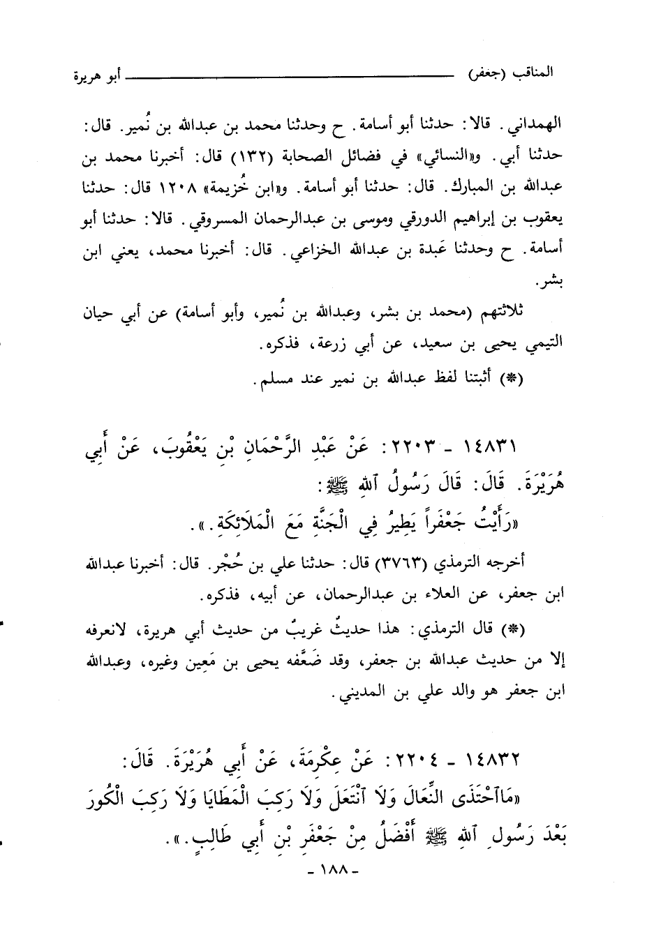 رَأَيْتُ جَعْفَرًا يَطِيرُ فِى الْجَنَّةِ مَعَ الْمَلَائِكَةِ. قَالَ هَذَا حَدِيثٌ غَرِيبٌ مِنْ حَدِيثِ أَبِى هُرَيْرَةَ لَا نَعْرِفُهُ إِلَاّ مِنْ حَدِيثِ عَبْدِ اللهِ بْنِ جَعْفَر.