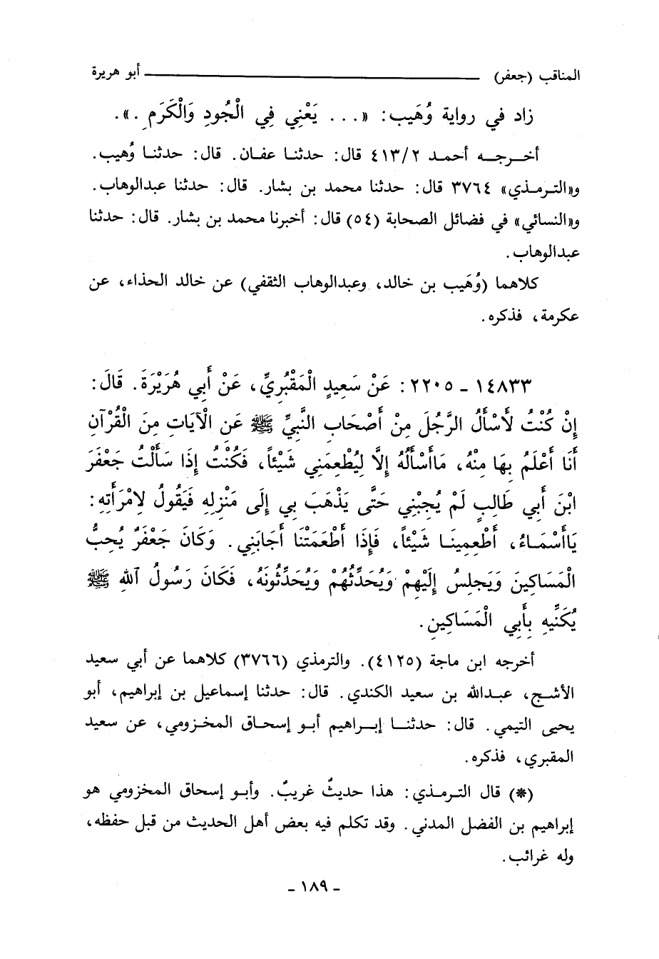 إِنْ كُنْتُ لأَسْأَلُ الرَّجُلَ مِنْ أَصْحَابِ النَّبِيِّ صلى الله عليه وسلم عَنِ الآيَاتِ مِنَ الْقُرْآنِ أَنَا أَعْلَمُ بِهَا مِنْهُ مَا أَسْأَلُهُ إِلَاّ لِيُطْعِمَنِى شَيْئًا فَكُنْتُ إِذَا سَأَلْتُ جَعْفَرَ بْنَ أَبِى طَالِبٍ لَمْ يُجِبْنِى حَتَّى يَذْهَبَ بِى إِلَى مَنْزِلِهِ فَيَقُولُ لاِمْرَأَتِهِ يَا أَسْمَاءُ أَطْعِمِينَا شَيْئًا. فَإِذَا أَطْعَمَتْنَا أَجَابَنِى وَكَانَ جَعْفَرٌ يُحِبُّ الْمَسَاكِينَ وَيَجْلِسُ إِلَيْهِمْ وَيُحَدِّثُهُمْ وَيُحَدِّثُونَهُ فَكَانَ رَسُولُ اللهِ صلى الله عليه وسلم يَكْنِيهِ بِأَبِى الْمَسَاكِينِ. قَالَ أَبُو عِيسَى هَذَا حَدِيثٌ غَرِيبٌ.