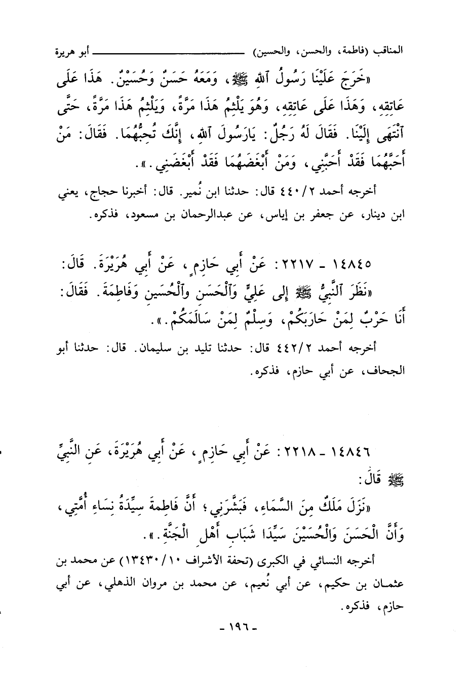نَظَرَ النَّبِيُّ صلى الله عليه وسلم إِلى عَلِيٍّ وَالْحَسَنًِ والْحُسَينِ وَفَاطِمَةَ. فَقَالَ: أنَا حَرْبٌ لِمَنْ حَارَبَكُمْ، وَسِلْمٌ لِمَنْ سَالَمَكُمْ.