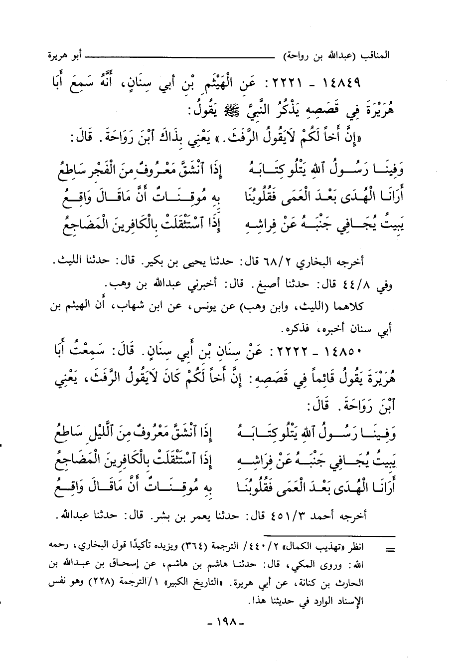 ١٤٨٥٠ - عَنْ سِنَانَ بْنَ أَبِى سِنَانٍ قَالَ: سَمِعْتُ أَبَا هُرَيْرَةَ يَقُولُ قَائِمًا فِى قَصَصِهِ إِنَّ أَخًَا لَكُمْ كَانَ لَا يَقُولُ الرَّفَثَ يَعْنِى ابْنَ رَوَاحَةَ قَالَ: