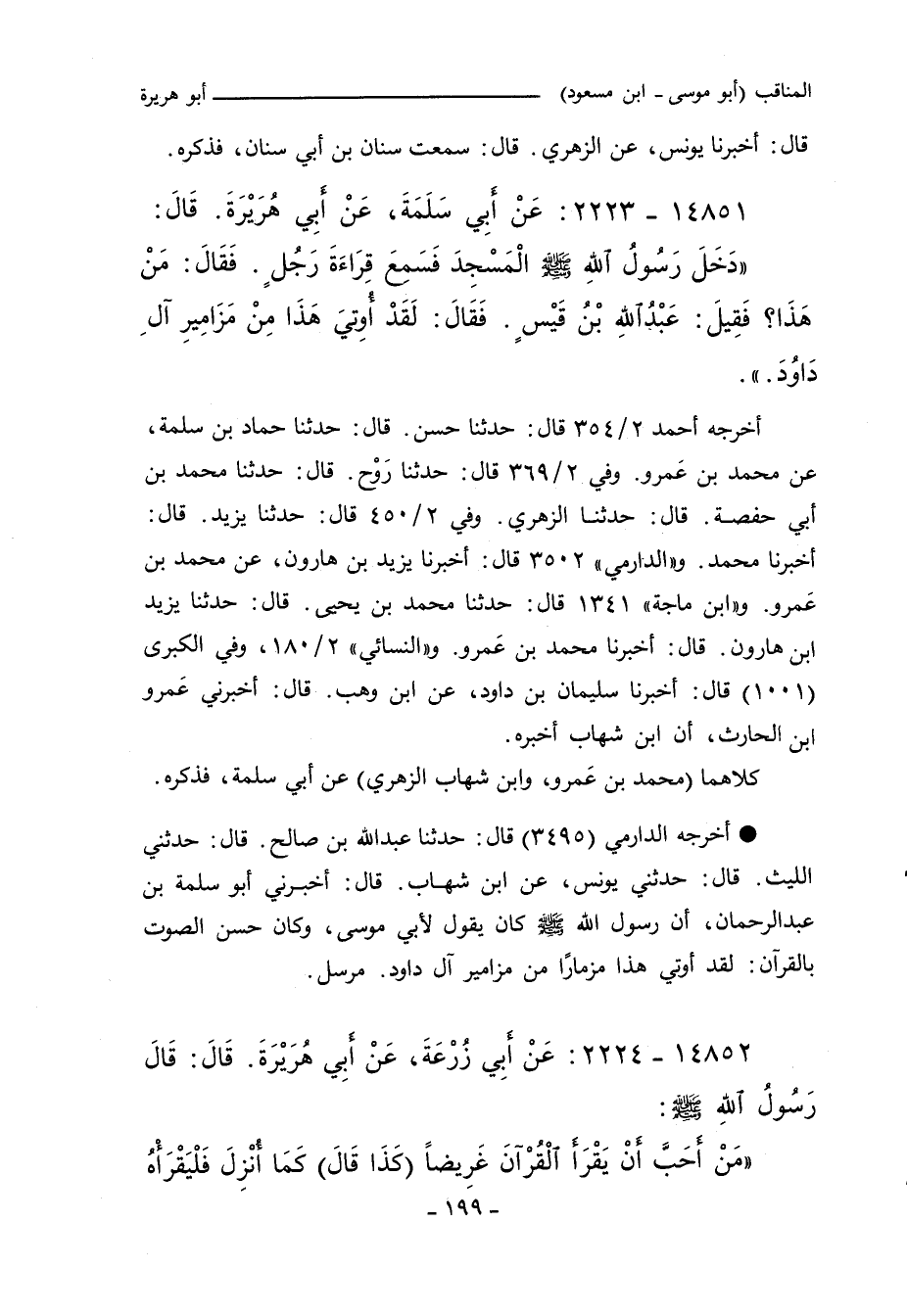 دَخَلَ رَسُولُ اللهِ صلى الله عليه وسلم الْمَسْجِدَ فَسَمِعَ قِرَاءَةَ رَجُلٍ فَقَالَ مَنْ هَذَا. قِيلَ عَبْدُ اللهِ بْنُ قَيْسٍ. فَقَالَ لَقَدْ أُوتِىَ هَذَا مِنْ مَزَامِيرِ آلِ دَاوُدَ.