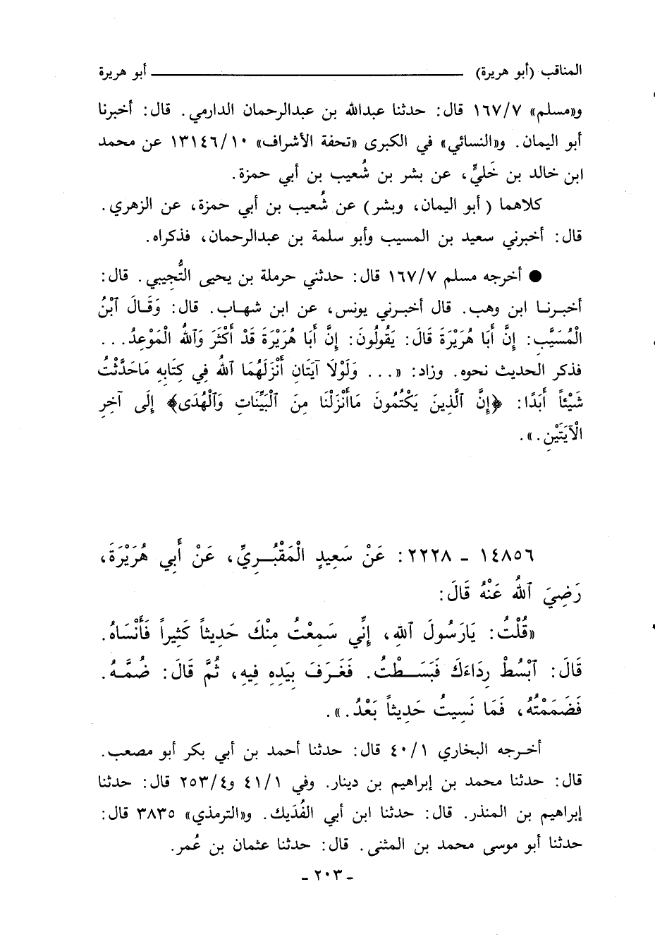 أخرجه مسلم ٧/ ١٦٧ قال: حدثني حرملة بن يَحيى التُّجِيبي، قال: أخبرنا ابن وهب. قال أخبرني يونس، عن ابن شهاب , قال: وَقَالَ ابْنُ الْمًسَيَّب: إِنَّ أبَا هُرَيْرَةَ قَالَ: يَقُولُونَ: إِنَّ أبَا هُرَيْرَةَ قَدْ أكْثَرَ وَاٌلله الْمَوْعِدُ. . . فذكر الَحديث نحوه. وزاد:. . . وَلَوْلا آيَتَانِ أنْزَلَهُمَا الله فِي كِتَابهِ مَاحَدَثْتُ شَيْئًا أبَدًا: إِنَّ اٌلَّذِينَ يَكْتًمونَ مَا أنْزَلْنَا مِنَ اٌلْبَيِّنَاتِ وَالْهًدَى*َ إِلَى آخِرِ الايَتَيْنِ.