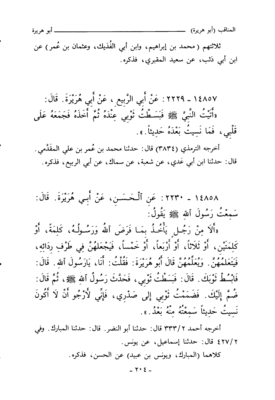 أَلَا مِنْ رَجُلٍ يَأْخُذُ بِمَا فَرَضَ اللَّهُ وَرَسُولُهُ كَلِمَةً أَوْ كَلِمَتَيْنِ أَوْ ثَلَاثًا أَوْ أَرْبَعًا أَوْ خَمْسًا فَيَجْعَلُهُنَّ فِى طَرَفِ رِدَائِهِ فَيَتَعَلَّمُهُنَّ وَيُعَلِّمُهُنَّ. قَالَ أَبُو هُرَيْرَةَ فَقُلْتُ أَنَا يَا رَسُولَ اللهِ. قَالَ فَابْسُطْ ثَوْبَكَ. قَالَ فَبَسَطْتُ ثَوْبِى فَحَدَّثَ رَسُولُ اللهِ صلى الله عليه وسلم ثُمَّ قَالَ ضُمَّ إِلَيْكَ. فَضَمَمْتُ ثَوْبِى إِلَى صَدْرِى فَإِنِّى أَرْجُو أَنْ لَا أَكُونَ نَسِيتُ حَدِيثًا سَمِعْتُهُ مِنْهُ بَعْدُ.