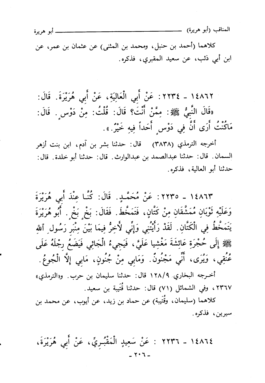 كُنَّا عِنْدَ أَبِى هُرَيْرَةَ وَعَلَيْهِ ثَوْبَانِ مُمَشَّقَانِ مِنْ كَتَّانٍ فَتَمَخَّطَ فَقَالَ بَخْ بَخْ أَبُو هُرَيْرَةَ يَتَمَخَّطُ فِى الْكَتَّانِ، لَقَدْ رَأَيْتُنِى وَإِنِّى لأَخِرُّ فِيمَا بَيْنَ مِنْبَرِ رَسُولِ اللهِ صلى الله عليه وسلم إِلَى حُجْرَةِ عَائِشَةَ مَغْشِيًّا عَلَىَّ، فَيَجِئُ الْجَائِى فَيَضَعُ رِجْلَهُ عَلَى عُنُقِى، وَيُرَى أَنِّى مَجْنُونٌ، وَمَا بِى مِنْ جُنُونٍ، مَا بِى إِلَاّ الْجُوعُ.