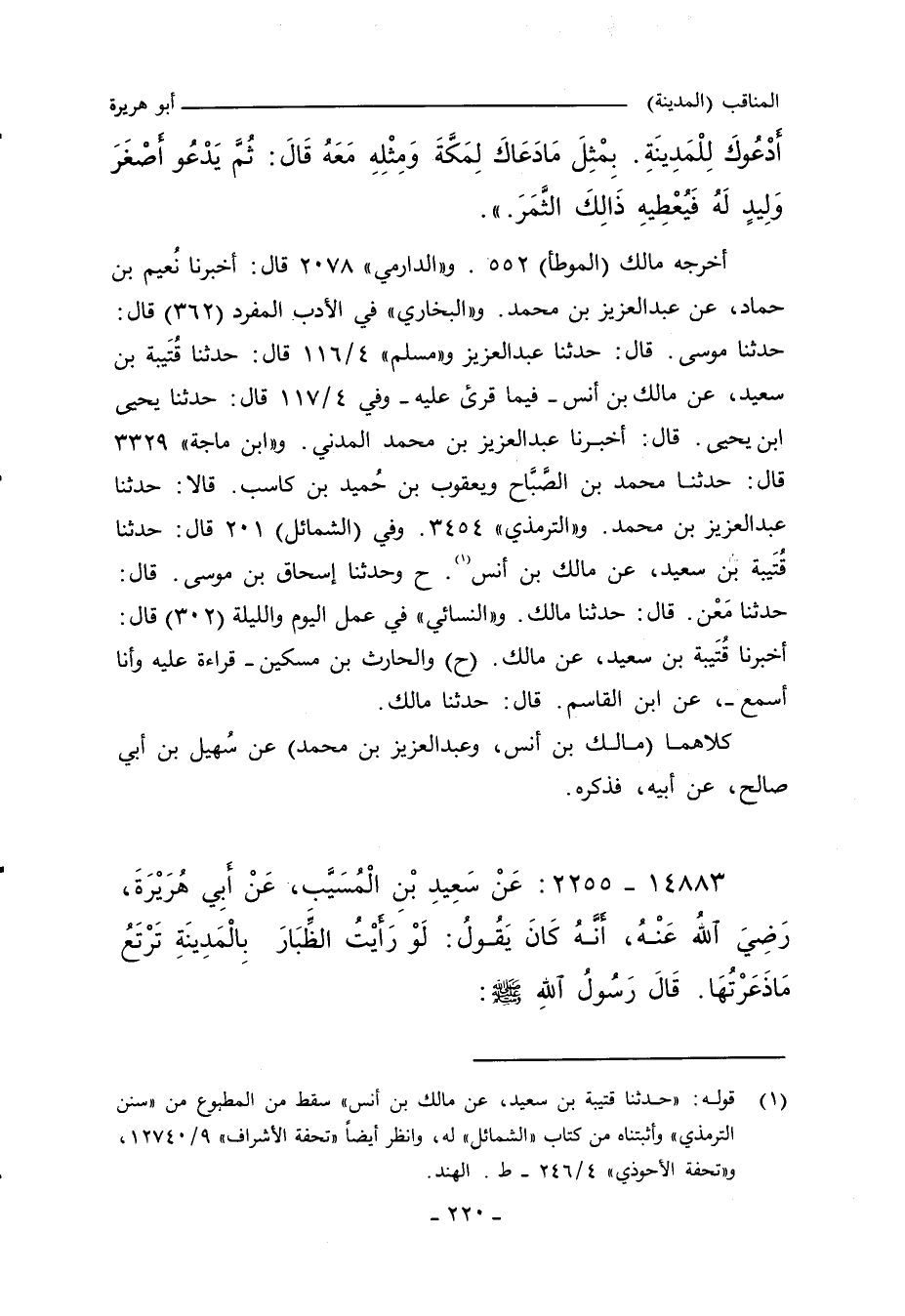١٤٨٨٣ - عَنْ سَعِيدِ بْنِ الْمُسَيَّبِ، عَنْ أَبِي هُرَيْرَةَ، رَضِيَ الله عَنْهُ، أنَّهُ كَانَ يَقُولُ: لَوْ رَأيْتُ الظًّبَارَ بِالْمَدِينَةِ تَرْتَعُ مَاذَعَرْتُةَ. قَالَ رَسُولُ اللهِ صلى الله عليه وسلم: