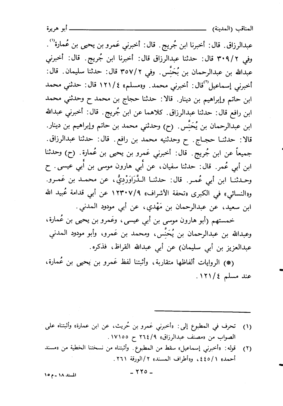 عبد الرزاق، قال: أخبرنا ابن جُريج, قال: أخبرني عَمرو بن يَحيى بن عُمارة. وفي ٢/ ٣٠٩ (٨٠٧٥) قال: حدَّثنا عبد الرزاق قال: أخبرنا ابن جُريج , قال: أخبرني عبد اللهِ بن عبد الرحمن بن بُحَنِّس. وفي ٢/ ٣٥٧ (٨٦٧٢) قال: حدَّثنا سليمان , قال: أخبرني إسماعيل قال: أخبرني محمد. و"مسلم" ٤/ ١٢١ قال: حدثني محمد بن حاتم وإبراهيم بن دينار. قالا: حدَّثنا حجاج بن محمد ح وحدثني محمد بن رافع قال: حدَّثنا عبد الرزاق. كلاهما عن ابن جُريج , قال: أخبرني عبد الله بن عبد الرحمن بن يُحَنِس. (ح) وحدثني محمد بن حاتم وإبراهيم بن دينار. قالا: حدَّثنا حجاج. ح وحدثنيه محمد بن رافع، قال: حدَّثنا عبد الرزاق. جميعًا عن ابن جُريج , قال: أخبرني عَمرو بن يَحيى بن عُمارة. (ح) وحدثنا ابن أبي عُمر، قال: حدَّثنا سفيان، عَنْ أَبِي هارون موسى بن أبي عيسى. ح وحدثنا ابن أبي عُمر، قال: حدَّثنا الدَّرَاوَرْدِيُّ، عن محمد بن عَمرو. و"النَّسائي" في "الكبرى" ٤٢٥٤ قال: أخبرنا عبيد الله بن سعيد أبو قدامة السرخسي , قال: حدَّثنا عبد الرحمن، قال: حدَّثني أَبِي مودود المدني.