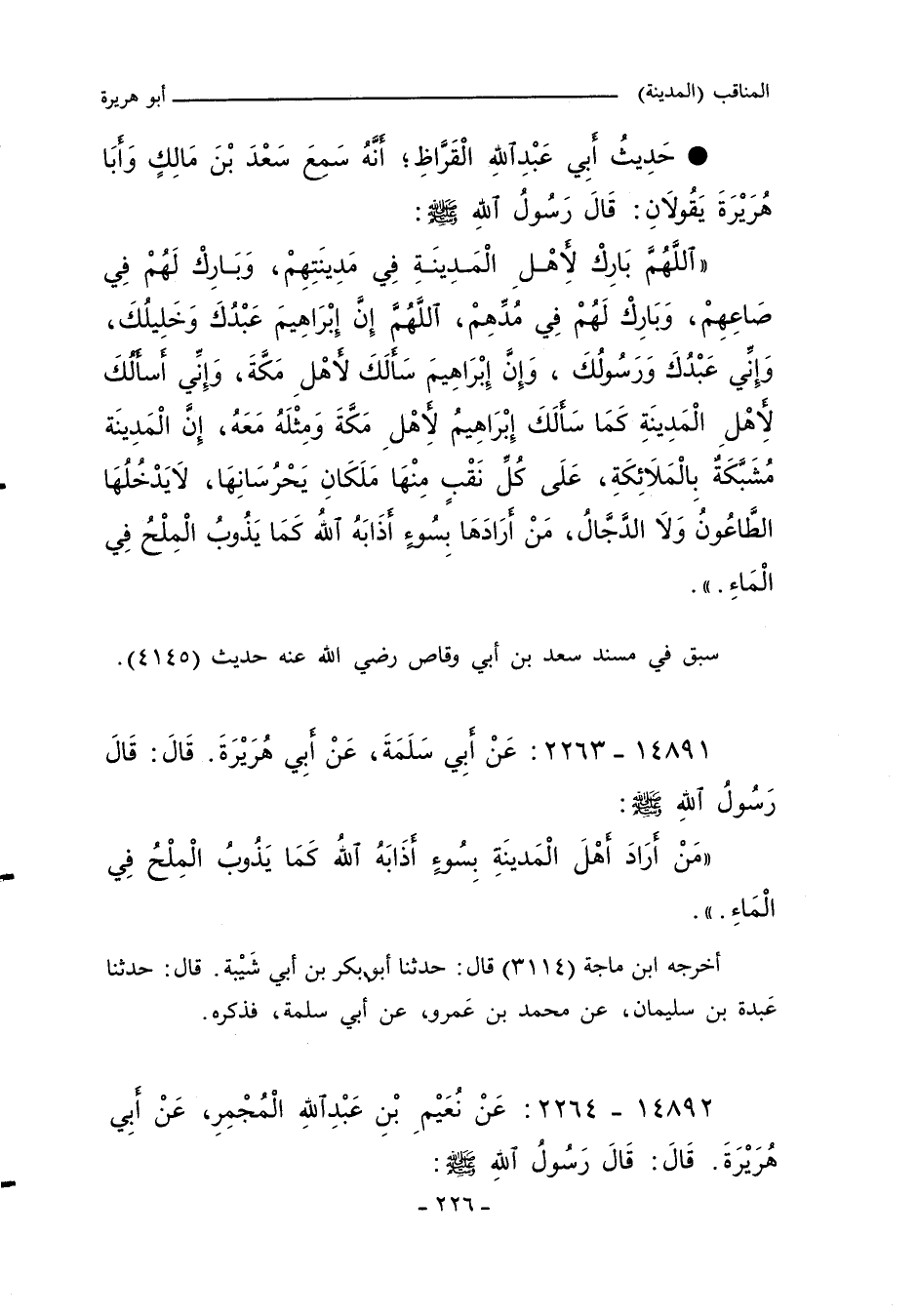 اللهمَّ بَارِكْ لأهْلِ الْمَدِينَةِ فِي مَدِينَتِهِمْ، وَبَارِكْ لَهُمْ فِي صَاعِهِمْ، وَبَارِكْ لَهُمْ فِي مُدِّهِمْ، اللهمَّ إِنَّ إِبْرَاهِيمَ عَبْدُكَ وَخَلِيلُكَ، وَإِنِّي عَبْدُكَ وَرَسُولُكَ، وَإِنَّ إِبْرَاهِيمَ سَألَكَ لأهْلِ مَكَّةَ، وَإِنِّي أسألُكَ لأهْل الْمَدِينَةِ كَمَا سَألَكَ إِبْرَاهِيمُ لأِهْلَ مَكَّةَ وَمِثْلَهُ مَعَهُ، إِنَّ الْمَدِينَة مُشَبَّكَةَ بِالْمَلائِكَةِ، عَلَى كُلِّ نَقْبٍ مِنْهَا مَلَكَانِ يَحْرُسَانِهَا، لايَدْخُلُهَا الطَّاعُونُ وَلا الدَّجَّالُ، مَنْ أرَادَهَا بِسُؤِ أذَابَهُ الله كَمَا يَذُوبُ الْمِلْحُ فِي الْمَاءِ.