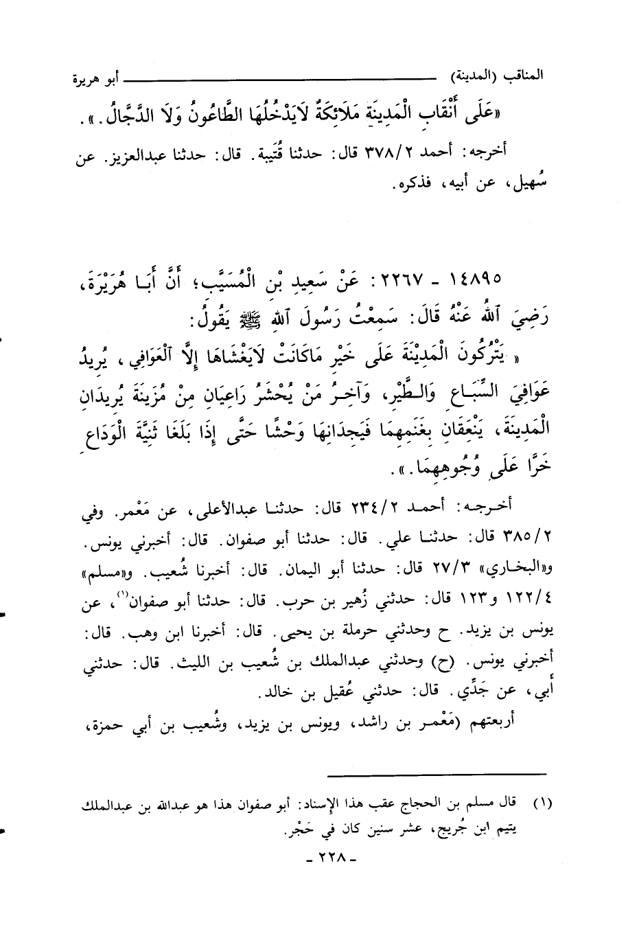 يَتْرُكُونَ الْمَدِينَةَ عَلَى خَيْرِ مَا كَانَتْ عَلَيْهِ لَا يَغْشَاهَا إِلَاّ الْعَوَافِى. قَالَ يُرِيدُ عَوَافِىَ السِّبَاعِ وَالطَّيْرِ وَآخِرُ مَنْ يُحْشَرُ رَاعِيَانِ مِنْ مُزَيْنَةَ يَنْعِقَانِ بِغَنَمِهِمَا فَيَجِدَاهَا وُحُوشًا حَتَّى إِذَا بَلَغَا ثَنِيَّةَ الْوَدَاعِ حُشِرَا عَلَى وُجُوهِهِمَا أَوْ خَرَّا عَلَى وُجُوهِهِمَا.