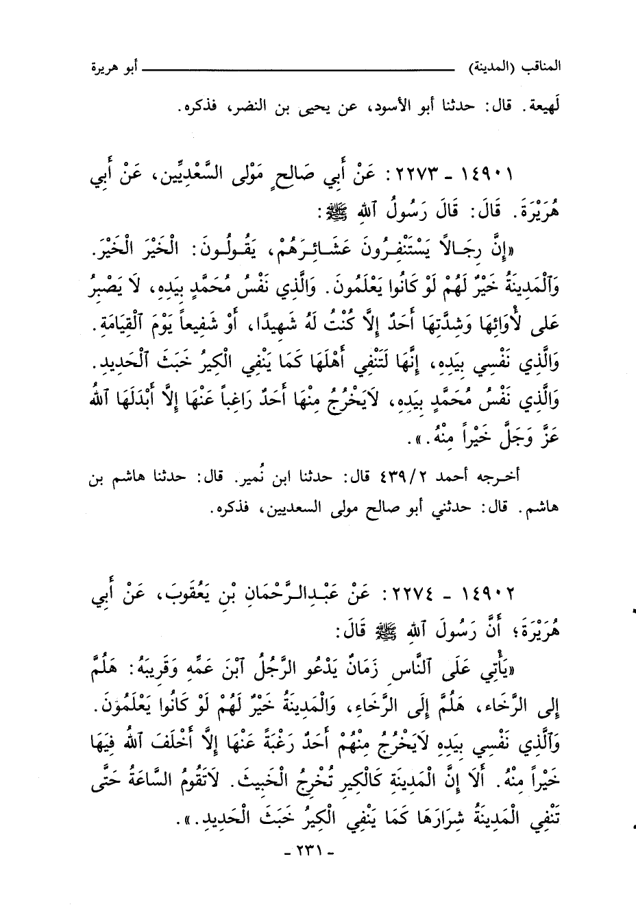 إِنَّ رِجَالاً يَسْتَنْفِرُونَ عَشَائِرَهُمْ يَقُولُونَ الْخَيْرَ الْخَيْرَ والْمَدِينَةُ خَيْرٌ لَهُمْ لَوْ كَانَُوا يَعْلَمُونَ وَالَّذِى نَفْسُ مُحَمَّدٍ بِيَدِهِ لَا يَصْبِرُ عَلَى لأْوَائِهَا وَشِدَّتِهَا أَحَدٌ إِلَاّ كُنْتُ لَهُ شَهِيدًا أَوْ شَفِيعًا يَوْمَ الْقِيَامَةِ وَالَّذِى نَفْسُ مُحَمَّدٍ بِيَدِهِ إِنَّهَا لَتَنْفِى أَهْلَهَا كَمَا يَنْفِى الْكِيرُ خَبَثَ الْحَدِيدِ وَالَّذِى نَفْسُ مُحَمَّدٍ بِيَدِهِ لَا يَخْرُجُ مِنْهَا أَحَدٌ رَاغِبًا عَنْهَا إِلَاّ أَبْدَلَهَا اللَّهُ عَزَّ وَجَلَّ خَيْرًا مِنْهُ.