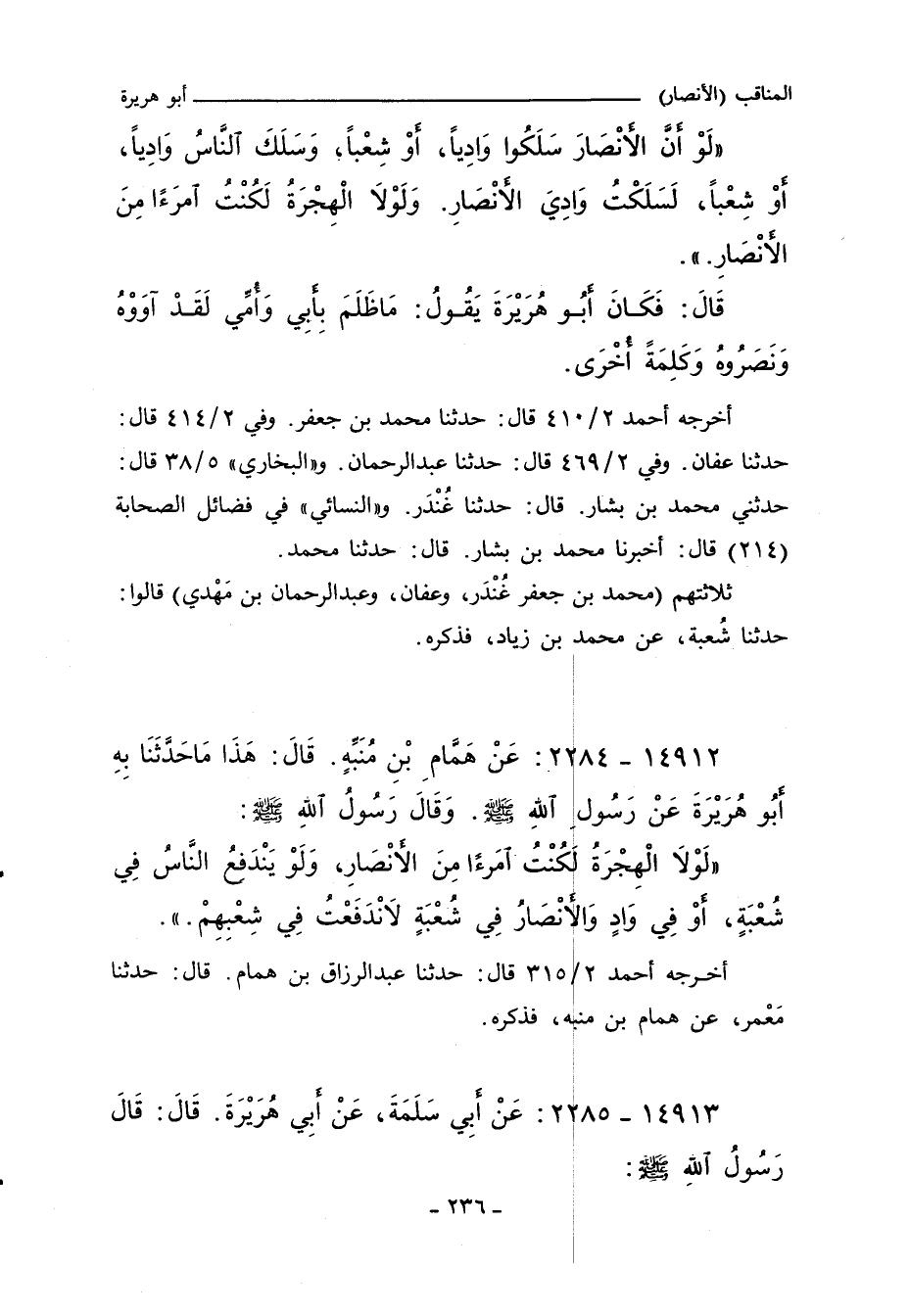 لَوْ أَنَّ الأَنْصَارَ سَلَكُوا وَادِيًا أَوْ شِعْبًا وَسَلَكَ النَّاسُ وَادِيًا أَوْ شِعْبًا لَسَلَكْتُ وَادِىَ الأَنْصَارِ وَلَوْلَا الْهِجْرَةُ لَكُنْتُ امْرَأً مِنَ الأَنْصَارِ. قَالَ فَكَانَ أَبُو هُرَيْرَةَ يَقُولُ مَا ظَلَمَ بِأَبِى وَأُمِّى لَقَدْ آوَوْهُ وَنَصَرُوهُ. وَكَلِمَةً أُخْرَى.