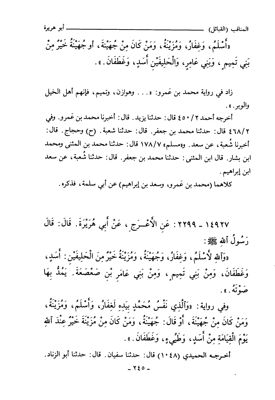 أَسْلَمُ وَغِفَارُ وَمُزَيْنَةُ وَجُهَيْنَةُ خَيْرٌ مِنْ بَنِى تَمِيمٍ وَمِنْ بَنِى عَامِرٍ وَالْحَلِيفَيْنِ بَنِى أَسَدٍ وَغَطَفَانَ.