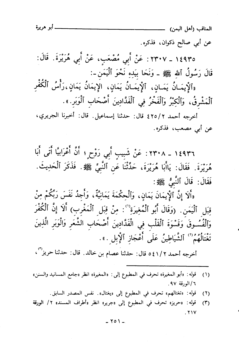 ١٤٩٣٥ - عَنْ أَبِي مُصْعَبٍ عَنْ أَبِي هُرَيْرَةَ قَالَ: قَالَ رَسُولُ اللهِ صلى الله عليه وسلم وَنَحَا بِيَدِهِ نَحْوَ الْيَمَنِ