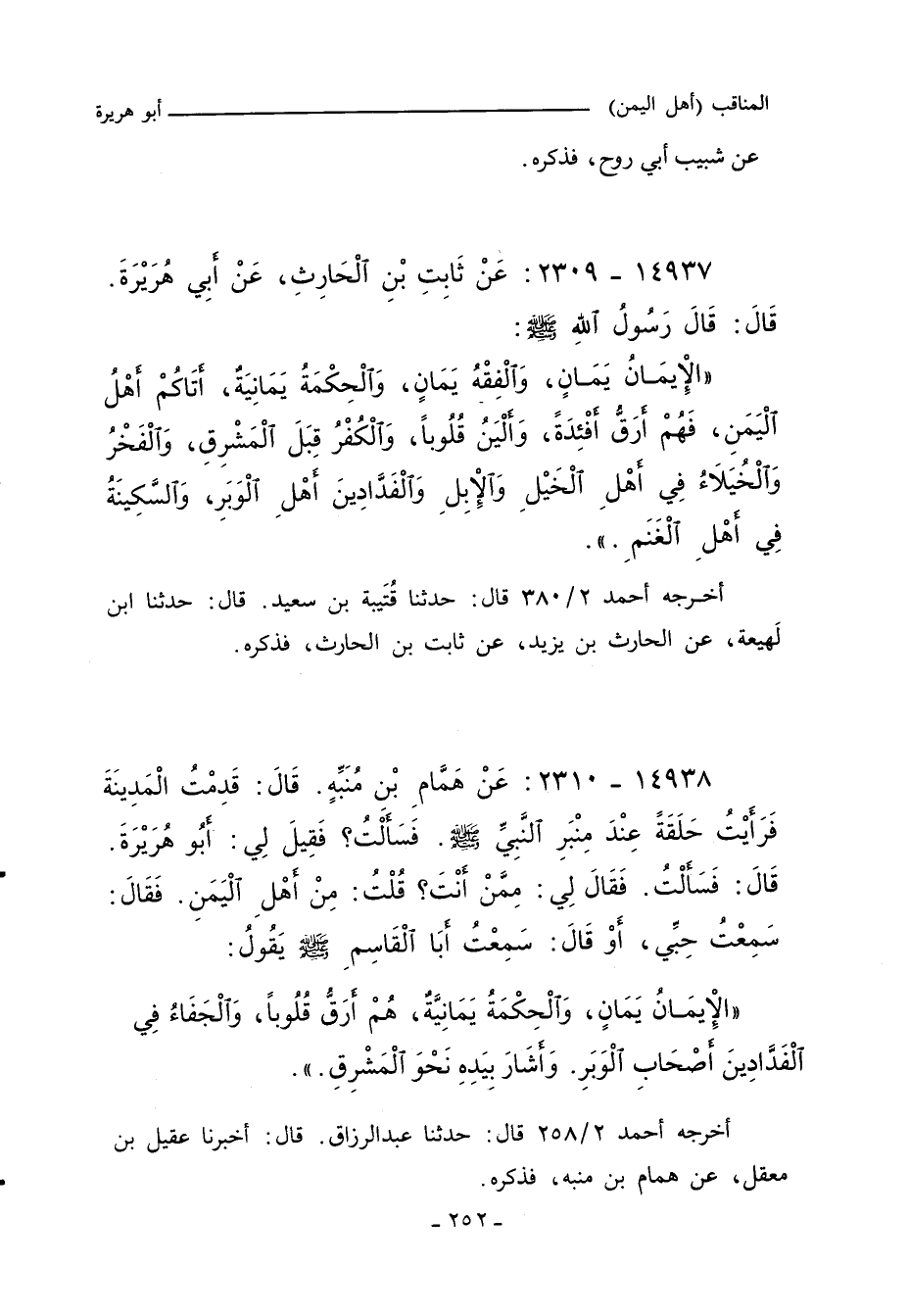 ١٤٩٣٨ - عَنْ هَمَّامِ بْنِ مُنَبِّهٍ قَالَ قَدِمْتُ الْمَدِينَةَ فَرَأَيْتُ حَلْقَةً عِنْدَ مِنْبَرِ النَّبِيِّ صلى الله عليه وسلم فَسَأَلْتُ فَقِيلَ لِى أَبُو هُرَيْرَةَ. قَالَ فَسَأَلْتُ فَقَالَ لِى مِمَّنْ أَنْتَ قُلْتُ مِنْ أَهْلِ الْيَمَنِ. فَقَالَ: سَمِعْتُ حِبِّى أَوْ قَالَ: سَمِعْتُ أَبَا الْقَاسِمِ صلى الله عليه وسلم يَقُولُ