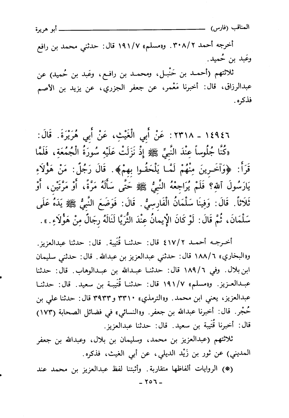 كُنَّا جُلُوسًا عِنْدَ النَّبِيِّ صلى الله عليه وسلم إِذْ نَزَلَتْ عَلَيْهِ سُورَةُ الْجُمُعَةِ فَلَّمَا قَرَأَ ?وَآخَرِينَ مِنْهُمْ لَمَّا يَلْحَقُوا بِهِمْ? قَالَ مَنْ هَؤُلَاءِ يَا رَسُولَ اللهِ فَلَمْ يُرَاجِعْهُ النَّبِيُّ صلى الله عليه وسلم حَتَّى سَأَلَهُ مَرَّةً أَوْ مَرَّتَيْنِ أَوْ ثَلَاثًا وَفِينَا سَلْمَانُ الْفَارِسِىُّ - قَالَ - فَوَضَعَ النَّبِيُّ صلى الله عليه وسلم يَدَهُ عَلَى سَلْمَانَ وَقَالَ لَوْ كَانَ الإِيمَانُ عِنْدَ الثُّرَيَّا لَنَالَهُ رِجَالٌ مِنْ هَؤُلَاءِ.