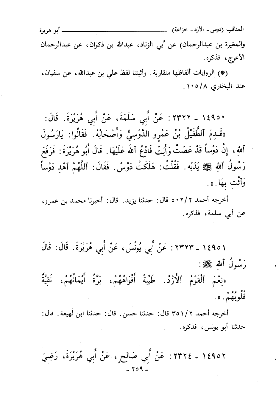 قَدِمَ الطُّفَيْلُ بْنُ عَمْرٍو الدَّوْسِىُّ وَأَصْحَابُهُ فَقَالَُوا يَا رَسُولَ اللهِ إِنَّ دَوْسًا قَدْ عَصَتْ وَأَبَتْ فَادْعُ اللَّهَ عَلَيْهَا. قَالَ أَبُو هُرَيْرَةَ فَرَفَعَ رَسُولُ اللهِ صلى الله عليه وسلم يَدَيْهِ فَقُلْتُ هَلَكَتْ دَوْسٌ. فَقَالَ اللَّهُمَّ اهْدِ دَوْسًا وَائْتِ بِهَا.