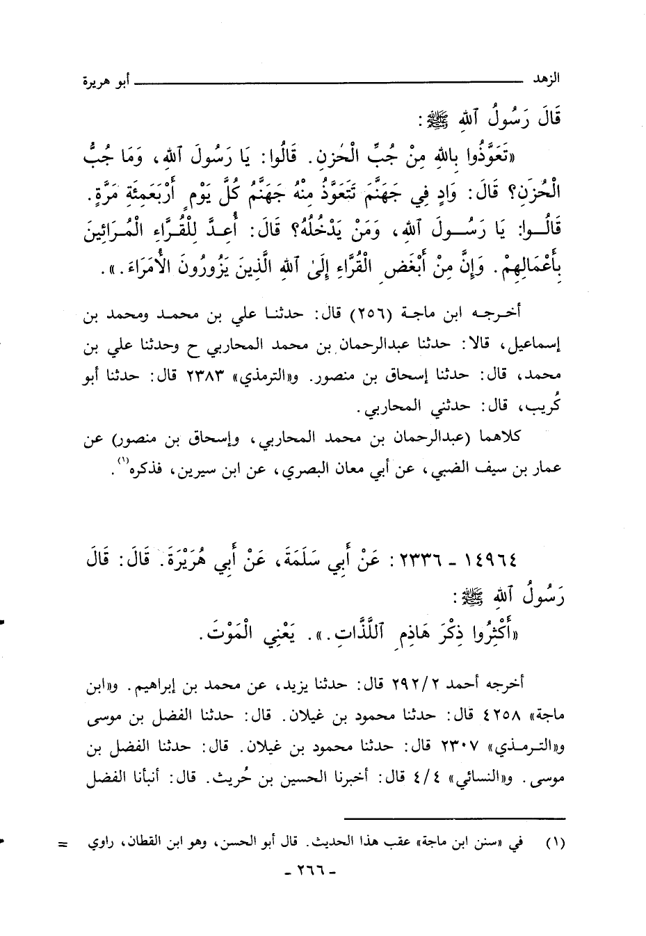 تَعَوَّذُوا بِاللهِ مِنْ جُبِّ الْحُزْنِ. قَالُوا يَا رَسُولَ اللهِ وَمَا جُبُّ الْحُزْنِ قَالَ وَادٍ فِى جَهَنَّمَ يَتَعَوَّذُ مِنْهُ جَهَنَّمُ كُلَّ يَوْمٍ أَرْبَعَمِائَةِ مَرَّةٍ. قَالُوا يَا رَسُولَ اللهِ وَمَنْ يَدْخُلُهُ قَالَ أُعِدَّ لِلْقُرَّاءِ الْمُرَائِينَ بِأَعْمَالِهِمْ وَإِنَّ مِنْ أَبْغَضِ الْقُرَّاءِ إِلَى اللهِ الَّذِينَ يَزُورُونَ الأُمَرَاءَ. قَالَ الْمُحَارِبِىُّ الْجَوَرَة.