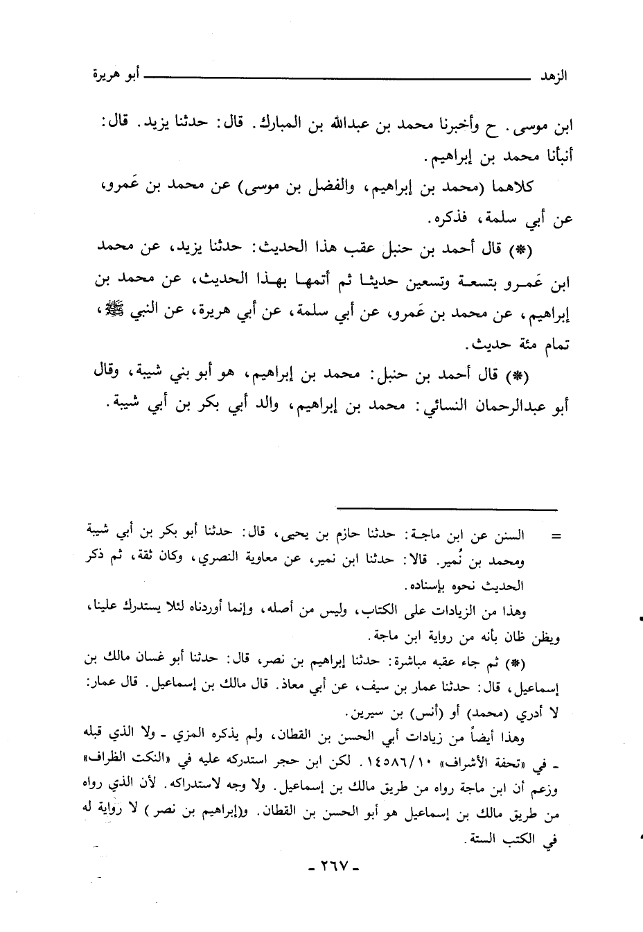 - قال أحمد بن حنبل عقب هذا الحديث: حدَّثنا يزيد، عن محمد ابن عَمرو بتسعة وتسعين حديثا ثم أتمها بهذا الحديث، عن محمد بن إبراهيم، عن محمد بن عَمرو، عَنْ أَبِي سلمة، عَنْ أَبِي هُرَيْرَةَ، عَنِ النَّبِيِّ صلى الله عليه وسلم، تمام مئة حديث.