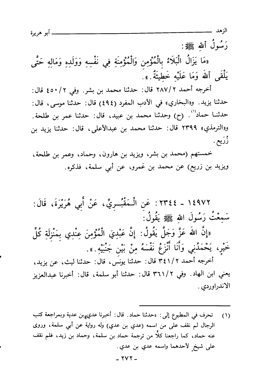 أخرجه أحمد ٢/ ٢٨٧ (٧٨٤٦) قال: حدَّثنا محمد بن بشر. وفي ٢/ ٤٥٠ (٩٨١٠) قال: حدَّثنا يزيد. و"البُخاري" في الأدب المفرد (٤٩٤) قال: حدَّثنا موسى، قال: حدَّثنا حماد. (ح) وحدثنا محمد بن عبيد، قال: حدَّثنا عمر بن طلحة. و"التِّرمِذي" ٢٣٩٩ قال: حدَّثنا محمد بن عبد الأعلى، قال: حدَّثنا يزيد بن زُيَلع. خمستهم (حمد بن بشر، ويزيد بن هارون، وحماد، وعمر بن طلحة، ويزيد بن زريع) عن محمد بن عَمرو، عَنْ أَبِي سلمة، فذكره.