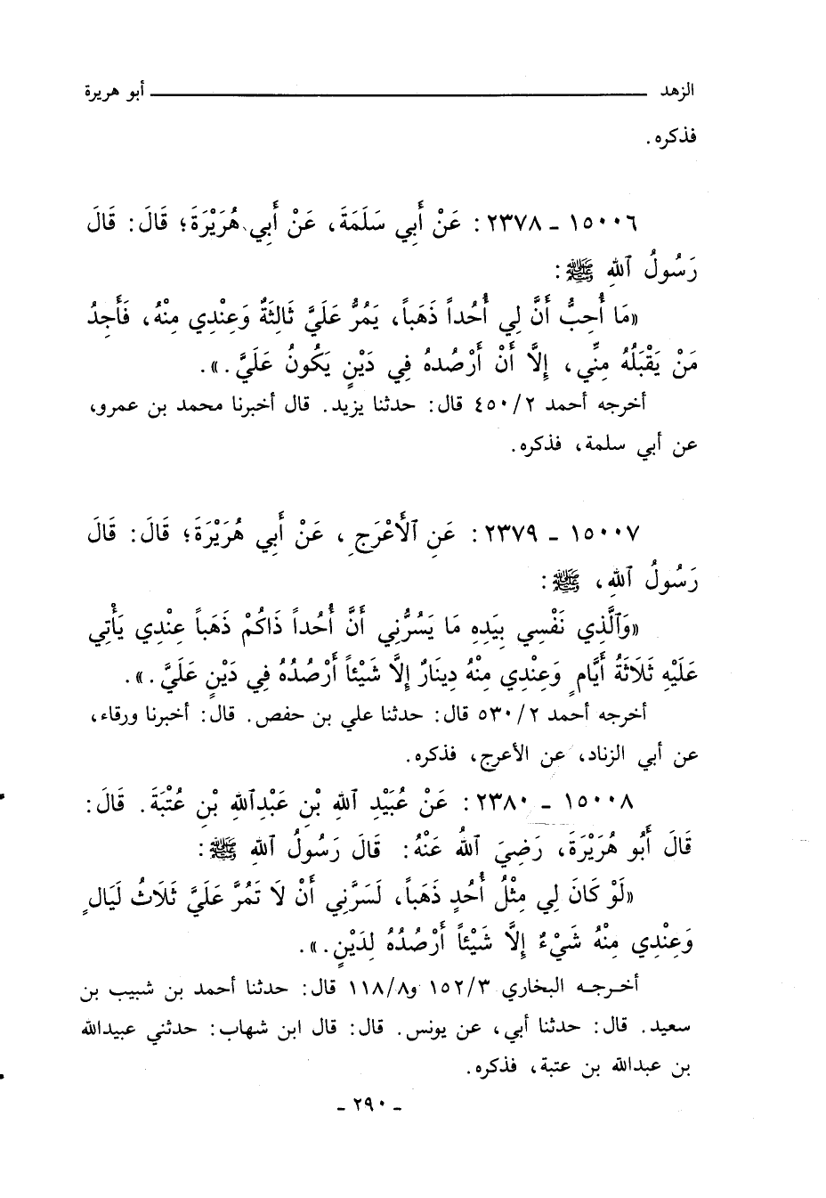 وَالَّذِى نَفْسِى بِيَدِهِ مَا يَسُرُّنِى أَنَّ أُحُدًا ذَاكُمْ ذَهَبًا عِنْدِى يَأْتِى عَلَيْهِ ثَلَاثَةُ أَيَّامٍ وَعِنْدِى مِنْهُ دِينَارٌ إِلَاّ شَيْئًا أَرْصُدُهُ فِى دَيْنٍ عَلَىَّ.