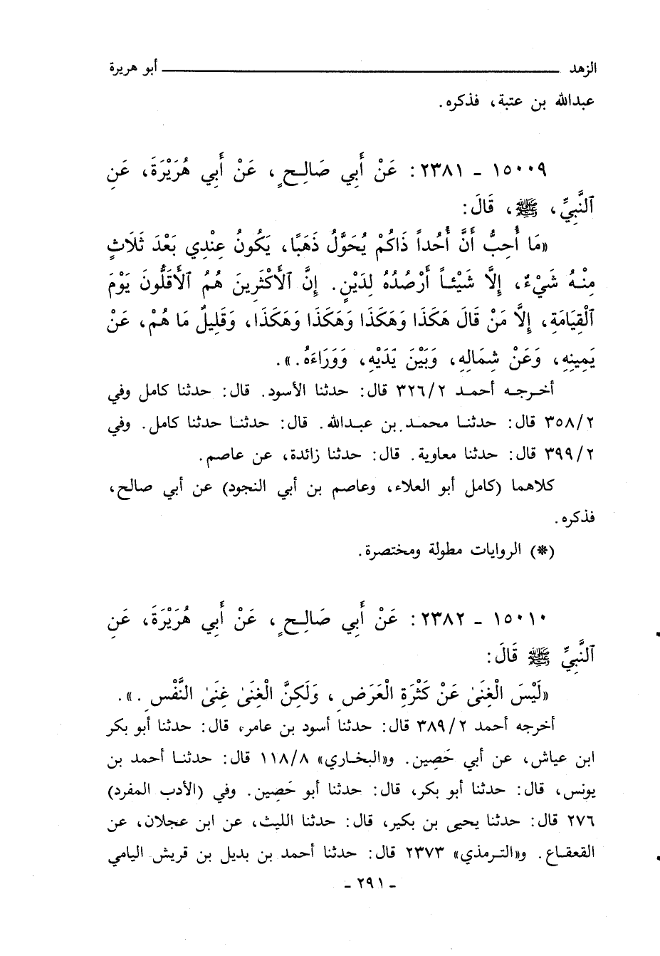 مَا أُحِبُّ أَنَّ أُحُدًا ذَاكُمْ يُحَوَّلُ ذَهَبًا يَكُونُ عِنْدِى بَعْدَ ثَلَاثٍ مِنْهُ شَىْءٌ إِلَاّ شَيْئًا أَرْصُدُهُ لِدَيْنٍ إِنَّ الأَكْثَرِينَ هُمُ الأَقَلُّونَ يَوْمَ الْقِيَامَةِ إِلَاّ مَنْ قَالَ هَكَذَا وَهَكَذَا وَهَكَذَا وَهَكَذَا وَقَلِيلٌ مَا هُمُ. عَنْ يَمِينِهِ وَعَنْ شِمَالِهِ وَبَيْنَ يَدَيْهِ وَوَرَاءَهُ.