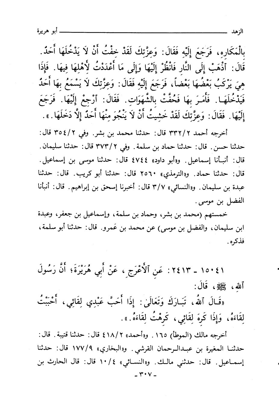 بِالْمَكَارِهِ فَرَجَعَ إِلَيْهِ فَقَالَ وَعِزَّتِكَ لَقَدْ خِفْتُ أَنْ لَا يَدْخُلَهَا أَحَدٌ. قَالَ اذْهَبْ إِلَى النَّارِ فَانْظُرْ إِلَيْهَا وَإِلَى مَا أَعْدَدْتُ لأَهْلِهَا فِيهَا. فَإِذَا هِىَ يَرْكَبُ بَعْضُهَا بَعْضًا فَرَجَعَ إِلَيْهِ فَقَالَ وَعِزَّتِكَ لَا يَسْمَعُ بِهَا أَحَدٌ فَيَدْخُلُهَا. فَأَمَرَ بِهَا فَحُفَّتْ بِالشَّهَوَاتِ فَقَالَ ارْجِعْ إِلَيْهَا. فَرَجَعَ إِلَيْهَا فَقَالَ وَعِزَّتِكَ لَقَدْ خَشِيتُ أَنْ لَا يَنْجُوَ مِنْهَا أَحَدٌ إِلَاّ دَخَلَهَا.