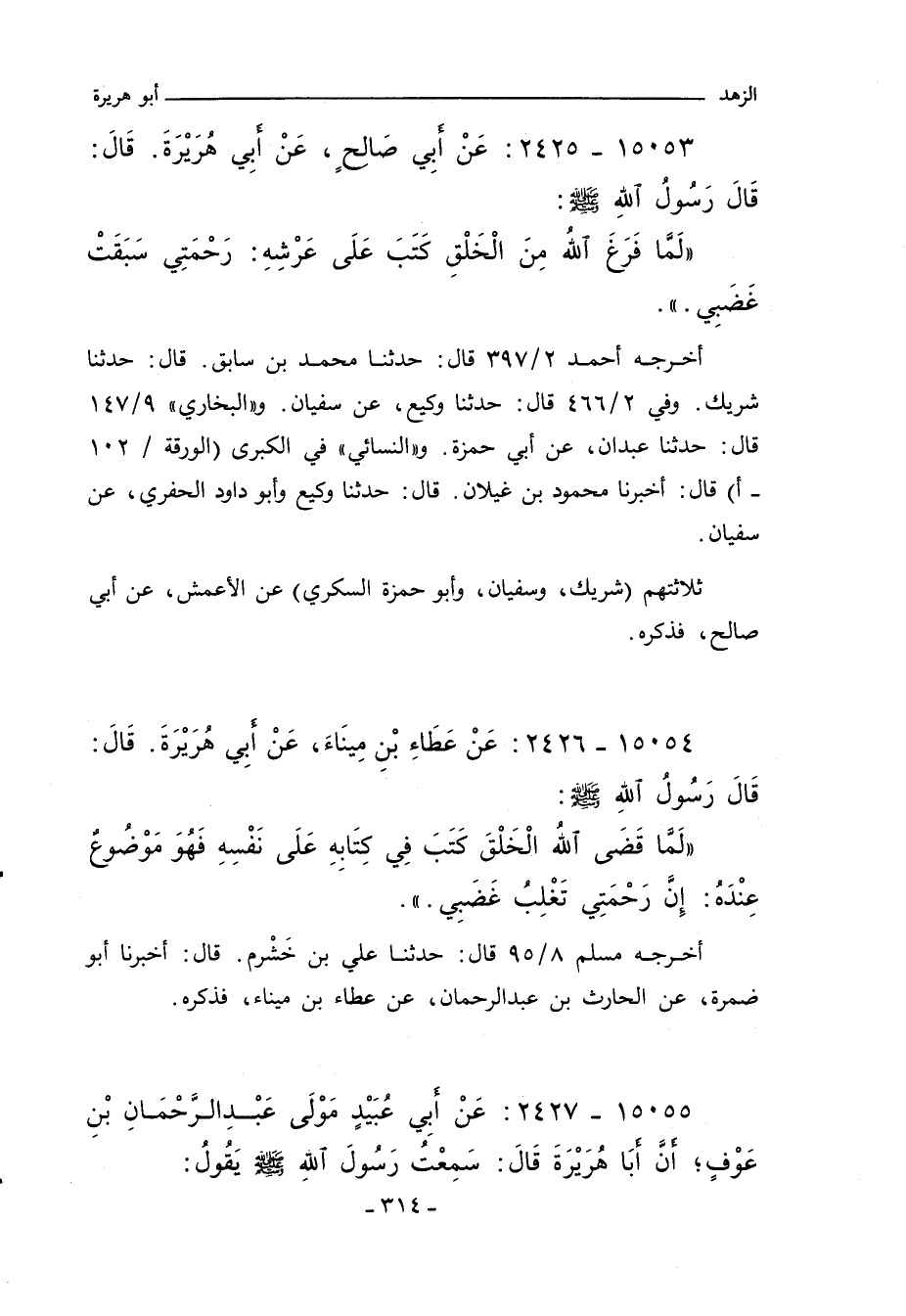 لَمَّا قَضَى اللَّهُ الْخَلْقَ كَتَبَ فِى كِتَابِهِ عَلَى نَفْسِهِ فَهُوَ مَوْضُوعٌ عِنْدَهَ إِنَّ رَحْمَتِى تَغْلِبُ غَضَبِى.