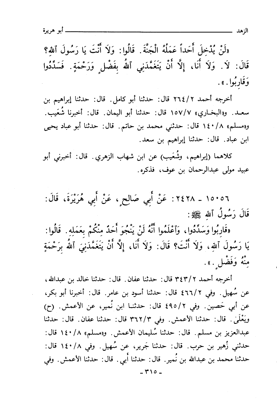 لَنْ يُدْخِلَ أَحَدًا عَمَلُهُ الْجَنَّةَ. قَالُوا وَلَا أَنْتَ يَا رَسُولَ اللهِ قَالَ لَا، وَلَا أَنَا إِلَاّ أَنْ يَتَغَمَّدَنِى اللَّهُ بِفَضْلٍ وَرَحْمَةٍ فَسَدِّدُوا وَقَارِبُوا.
