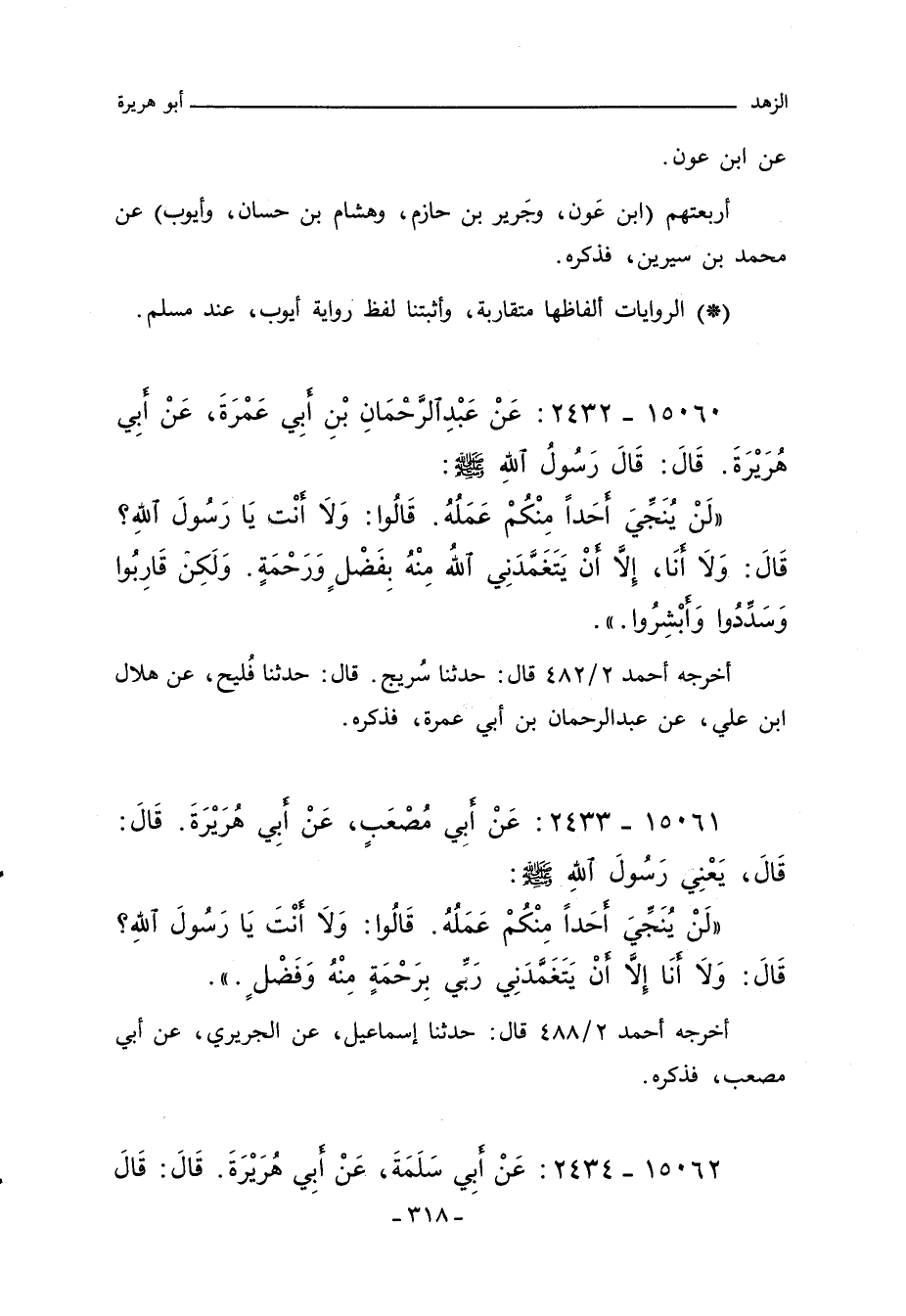 لَنْ يُنَجِّىَ أَحَدًا مِنْكُمْ عَمَلُهُ. قَالُوا وَلَا أَنْتَ يَا رَسُولَ اللهِ قَالَ وَلَا أَنَا إِلَاّ أَنْ يَتَغَمَّدَنِى اللَّهُ مِنْهُ بِفَضْلٍ وَرَحْمَةٍ وَلَكِنْ قَارِبُوا وَسَدِّدُوا وَأَبْشِرُوا.