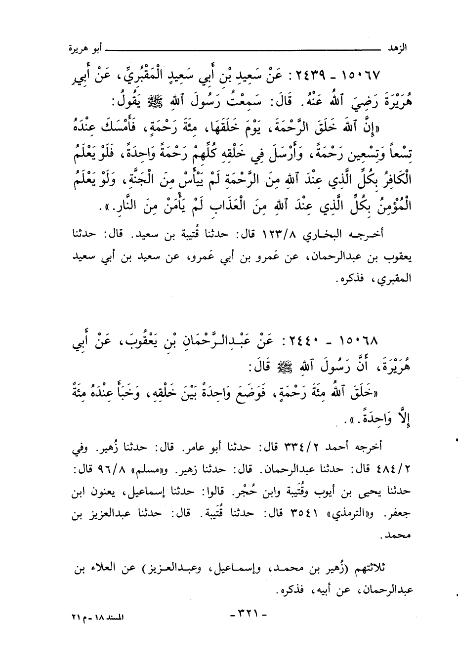 أخرجه أحمد ٢/ ٣٣٤ (٨٣٩٦) قال: حدَّثنا أبو عامر، قال: حدَّثنا زُهير. وفي ٢/ ٤٨٤ (١٠٢٨٥) قال: حدَّثنا عبد الرحمن، قال: حدَّثنا زهير. و"مسلم" ٨/ ٩٦ قال: حدَّثنا يَحيى بن أيوب وقُتَيبة وابن حُجْر. قالوا: حدَّثنا إسماعيل، يعنون ابن جعفر. و"التِّرمِذي" ٣٥٤١ قال: حدَّثنا قُتَيبة، قال: حدَّثنا عبد العزيز بن محمد.