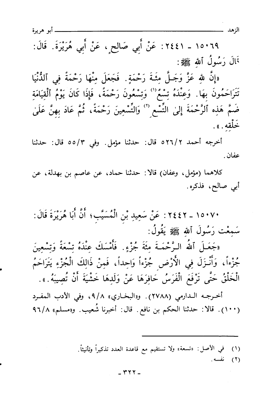 إِنَّ لِلَّهِ عَزَّ وَجَلَّ مِائَةَ رَحْمَةٍ فَجَعَلَ مِنْهَا رَحْمَةً فِى الدُّنْيَا تَتَرَاحَمُونَ بِهَا وَعِنْدَهُ تِسْعَةٌ وَتِسْعُونَ رَحْمَةً فَإِذَا كَانَ يَوْمُ الْقِيَامَةِ ضَمَّ هَذِهِ الرَّحْمَةَ إِلَى التِّسْعَةِ والتِسْعِينَ رَحْمَةً ثُمَّ عَادَ بِهِنَّ عَلَى خَلْقِهِ.