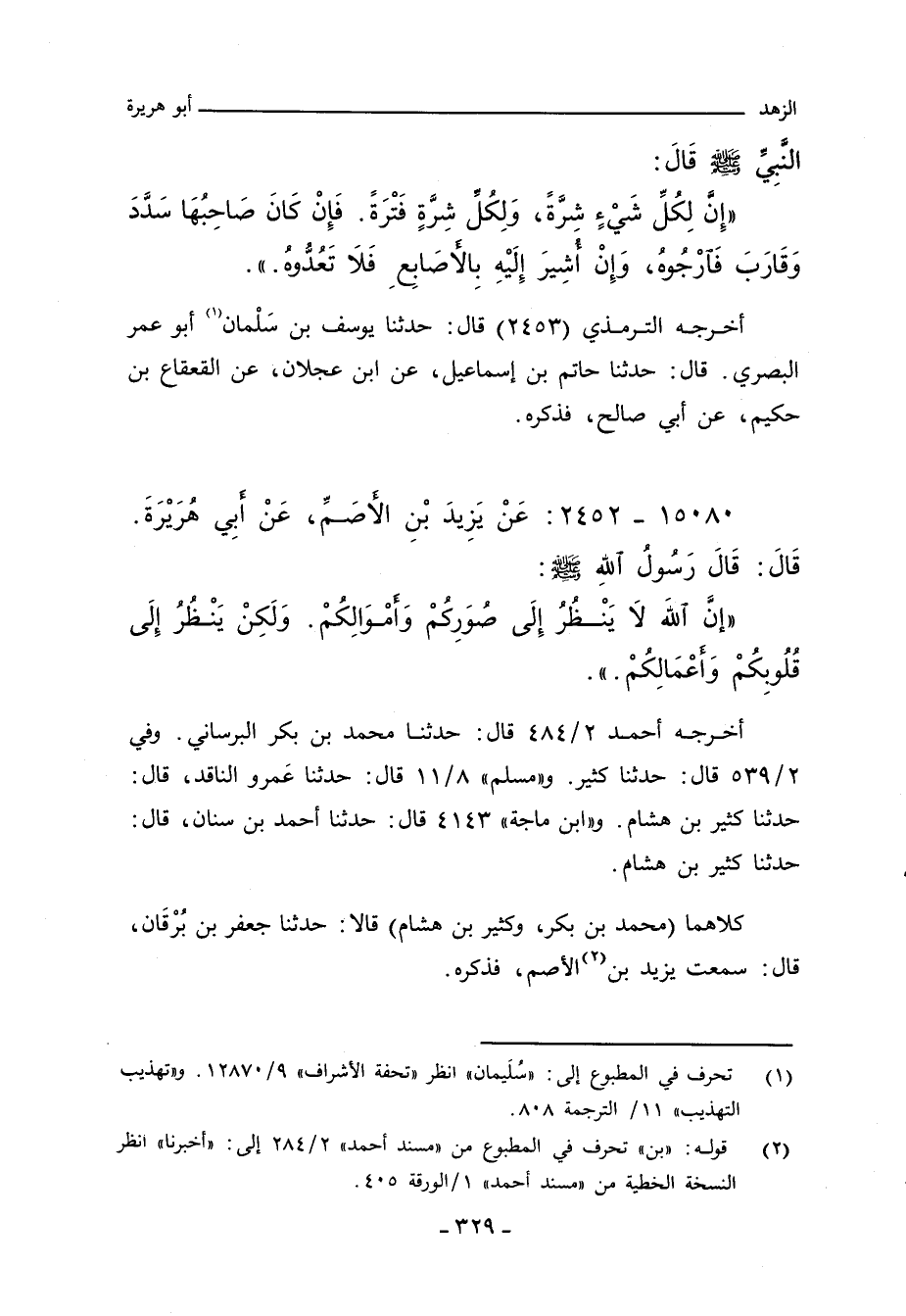 إِنَّ لِكُلِّ شَىْءٍ شِرَّةً وَلِكُلِّ شِرَّةٍ فَتْرَةً فَإِنْ كَانَ صَاحِبُهَا سَدَّدَ وَقَارَبَ فَارْجُوهُ وَإِنْ أُشِيرَ إِلَيْهِ بِالأَصَابِعِ فَلَا تَعُدُّوهُ.