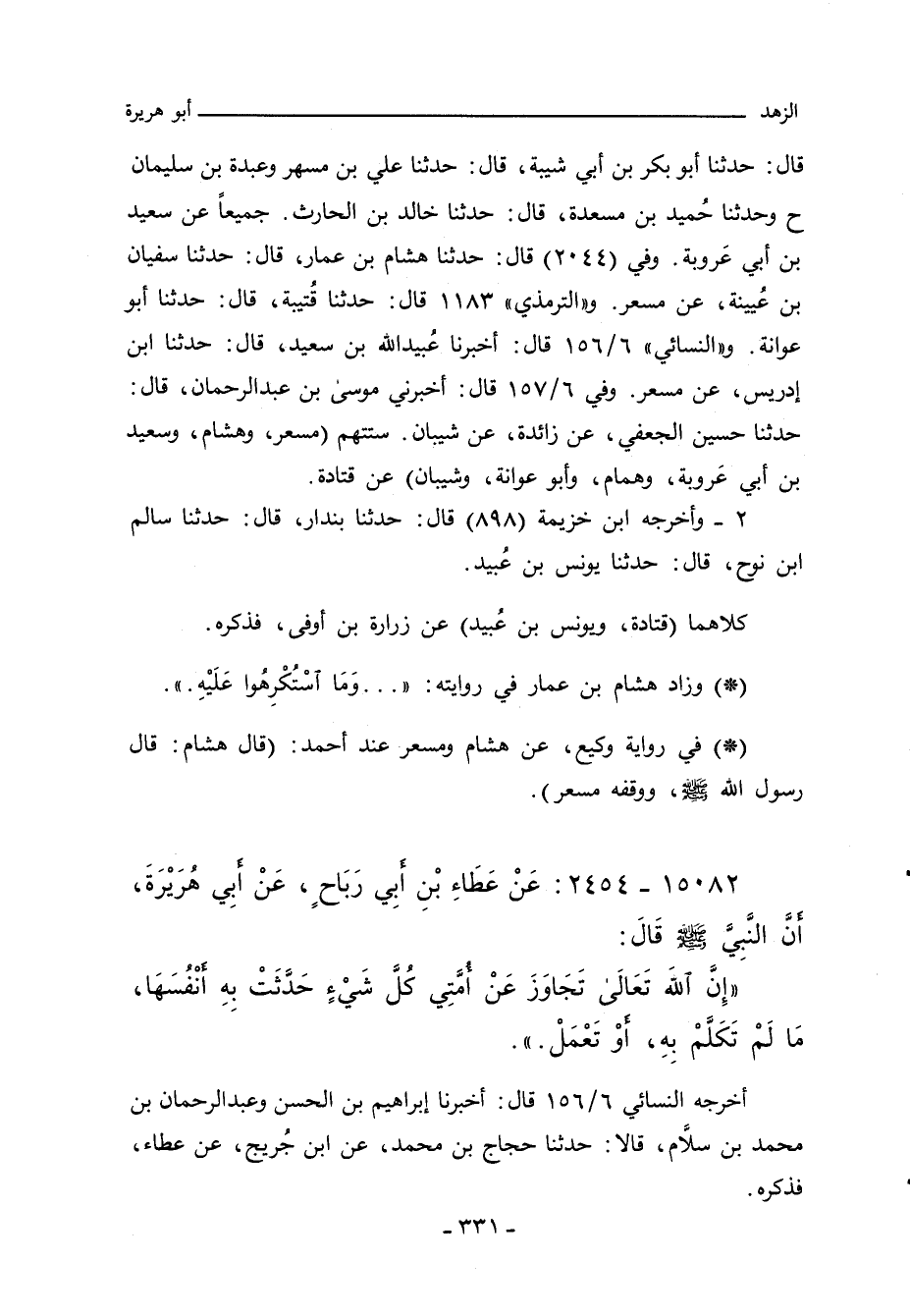 قَالَ عَبْدُ الرَّحْمَنِ عَنْ رَسُولِ اللهِ صلى الله عليه وسلم قَالَ إِنَّ اللَّهَ تَعَالَى تَجَاوَزَ عَنْ أُمَّتِى كُلَّ شَىْءٍ حَدَّثَتْ بِهِ أَنْفُسَهَا مَا لَمْ تَكَلَّمْ بِهِ أَوْ تَعْمَلْ.