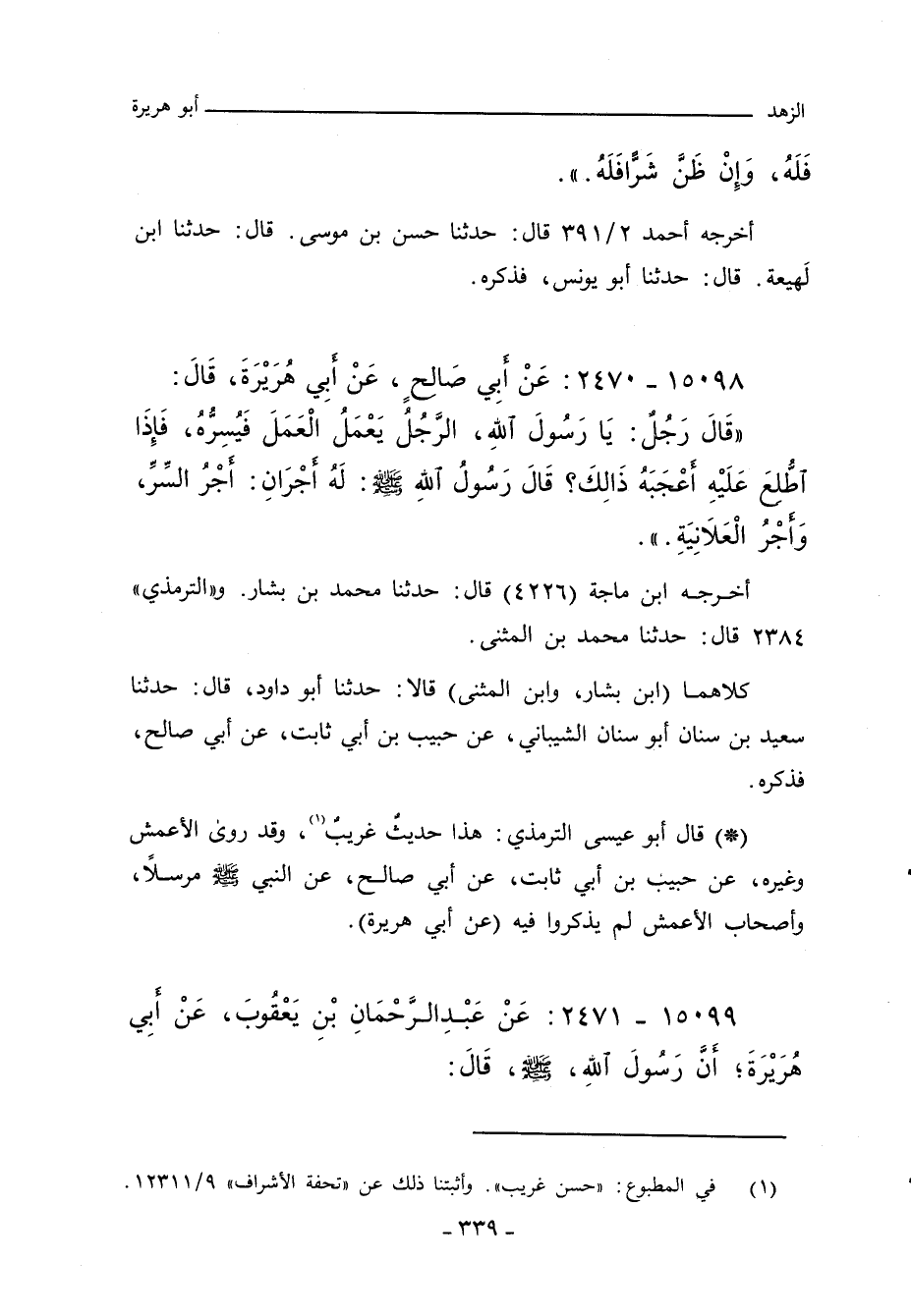 - قال أبو عيسى الترمذي: هذا حديث غريبٌ، وقد روئ الأعمش وغيره، عن حبيب بن أبي ثابت، عَنْ أَبِي صَالِحٍ، عَنِ النَّبِيِّ لمج! ز مرسلاً، وأصحاب الأعمش لم يذكروا فيه (عَنْ أَبِي هُرَيْرَةَ).